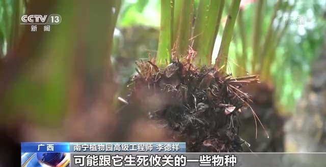 德保苏铁在野外的数量非常少,成年植株可能都不到500株,属于濒临灭绝的状态。我们在自然界里面,如果某一个物种灭绝了,可能跟它生死攸关的一些物种,包括植物动物,就可能有10种以上就会紧跟着要灭绝,所以我们要保留这个物种的基因,就需要去做一些保护工作。把德保苏铁保护好了,才能够保护好和它相关的动物、植物和微生物,也才能保护好当地的生态环境和生物多样性。