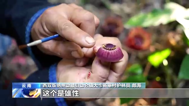 西双版纳州勐腊县勐仑镇大卡新寨村护林员 郎海:这个花一般开是四五天左右,最长四五天它就会变黑。我们把(花)粉抹下来,涂到雌花这里。成功的话,明年6月份就可以看得到结果。我必须把人工授粉做出来,因为科研人员托付给我,我一定要办到这个事情,必须爱护好必须保护好这些(自然资源)。
