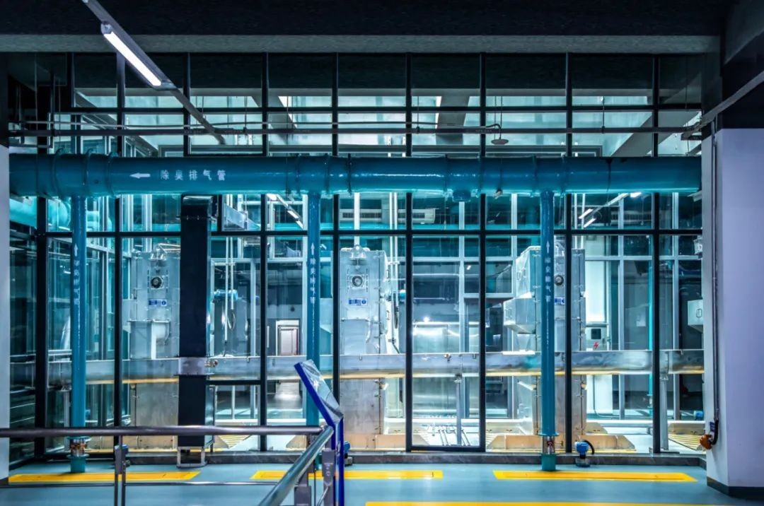 占地面积由传统水厂的约17公顷,减少到4.47公顷,节省土地70%以上,基本实现了“零占地”。同时,主要处理设备厂房,均建在地下16米到18米处,通过多级多段生物除臭系统,实现对污水及处理污水过程中产生的臭气、污泥,进行封闭收集处理。既隔音又隔臭,通过采用自然采光技术,为地下空间输送光源,以空气悬浮鼓风机代替传统离心风机。利用水源热泵进行控温等举措,全年可约电量超过500万千瓦时,减少二氧化碳约480吨,实现减污降碳协同增效。