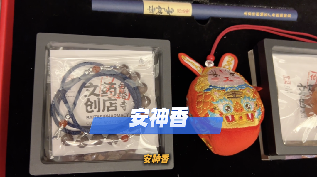 记者与全国人大代表、北京金象复星医药股份有限公司、白塔寺药店总药剂师张海鸥交换得到一个文创礼盒,里面装有药香珠项链、安神香、中药香包。张海鸥今年上会带来9个建议,其中5个与中医中药和健康促进相关,她表示,特别想通过这类文创,吸引年轻人喜爱中医中药。