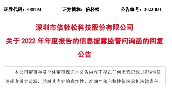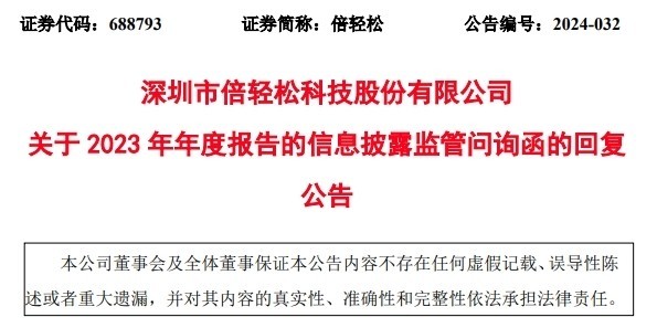 7月4日,倍轻松还发布了《关于2024年年度报告的信息披露监管问询函的回复公告》。