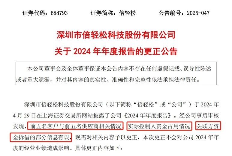 2025年7月4日,倍轻松披露了《关于2024年年度报告的更正公告》等一系列文件。
