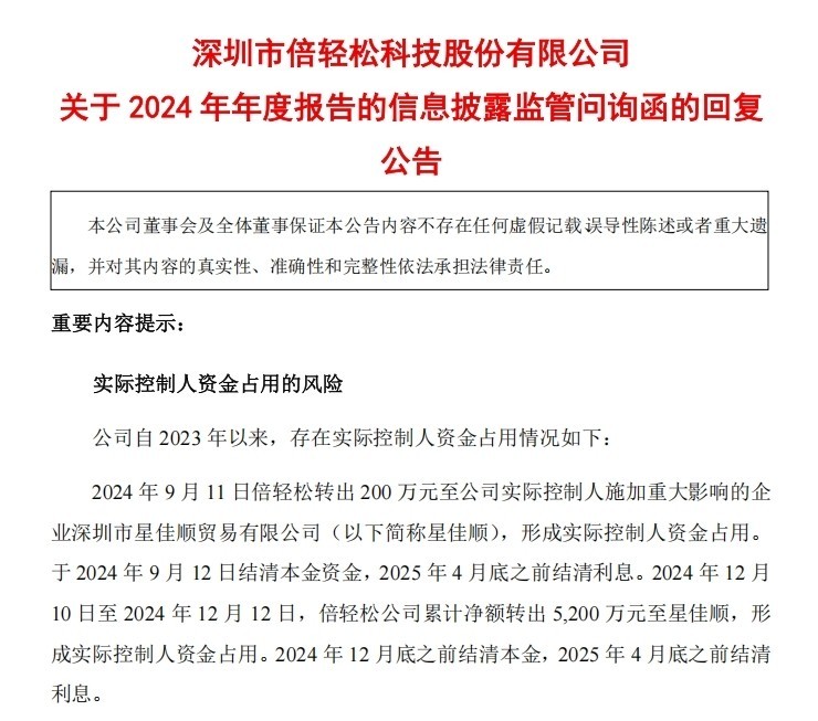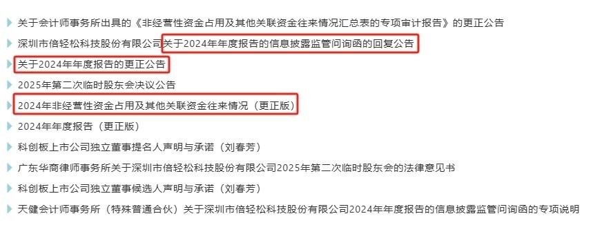 伴随最新监管工作函,倍轻松还发布了《关于2024年年度报告的信息披露监管问询函的回复公告》、《关于2024年年度报告的更正公告》及《2024年非经营性资金占用及其他关联资金往来情况(更正版)》等一系列文件。