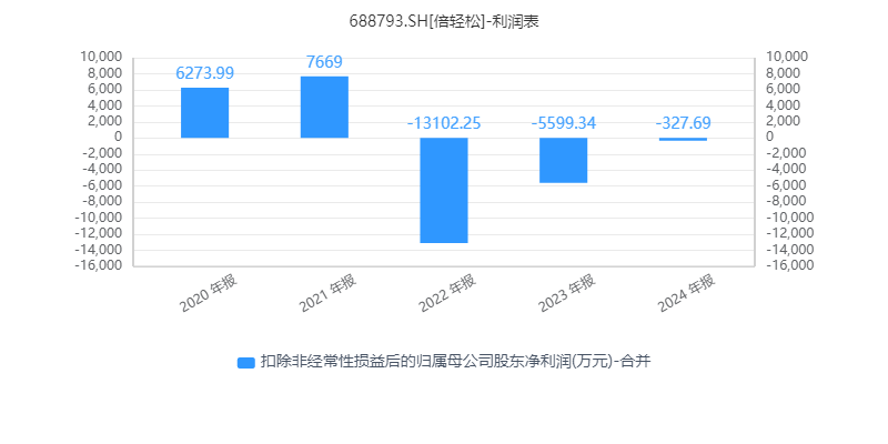 倍轻松近五年年度扣非归母净利润情况。图片来源:同花顺iFinD