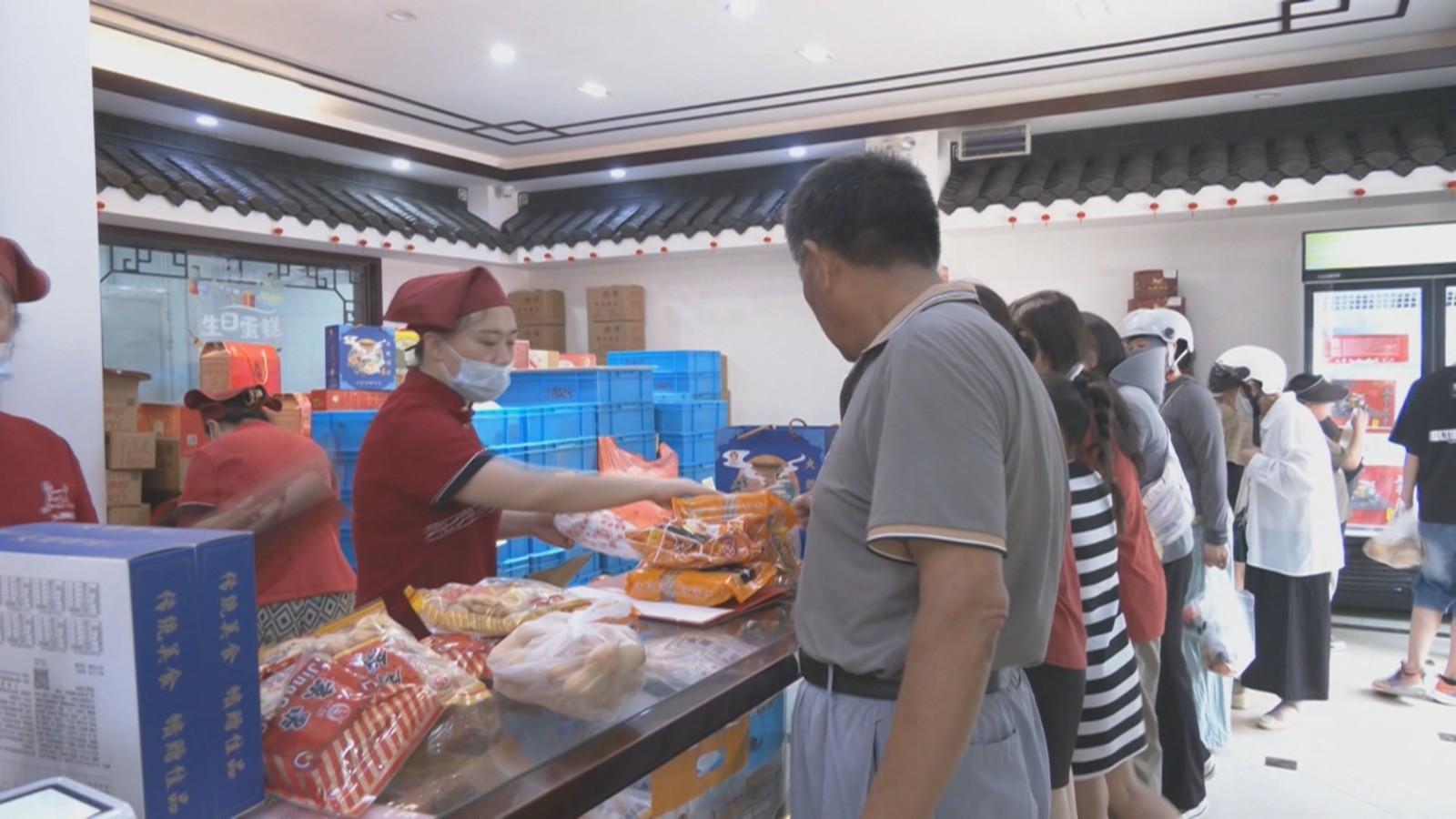 青岛游客小刘:正好要回去带一些伴手礼送长辈,我觉得这些(苏式月饼)糕点很有特色。