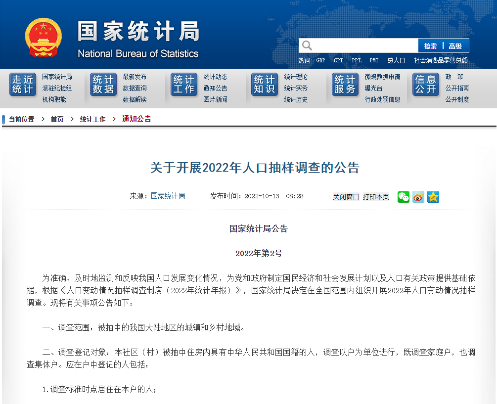 为准确、及时地监测和反映我国人口发展变化情况,为党和政府制定国民经济和社会发展计划以及人口有关政策提供基础依据,根据《人口变动情况抽样调查制度(2022年统计年报)》,国家统计局决定在全国范围内组织开展2022年人口变动情况抽样调查。