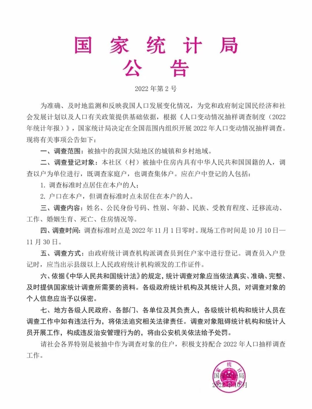 为准确、及时地监测和反映我国人口发展变化情况,为党和政府制定国民经济和社会发展计划以及人口有关政策提供基础依据,根据《人口变动情况抽样调查制度(2022年统计年报)》,国家统计局决定在全国范围内组织开展2022年人口变动情况抽样调查。现将有关事项公告如下: