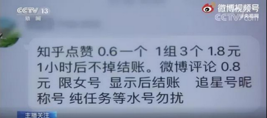 还有一位大三学生小凡,兼职做过网络水军“工头”,说白了就是接收上级代理发布的任务,再组织网络水军进行推广。任务不同、平台不同,所获佣金也不同。在知乎、微博上点赞一条,赚0.3元;微博上代发一条内容,赚0.3元;在B站上点赞、收藏、转发,赚1元。她说每天也就赚个奶茶钱,有时候要花一整天时间盯进度,太耗费时间,自己打算退出了。