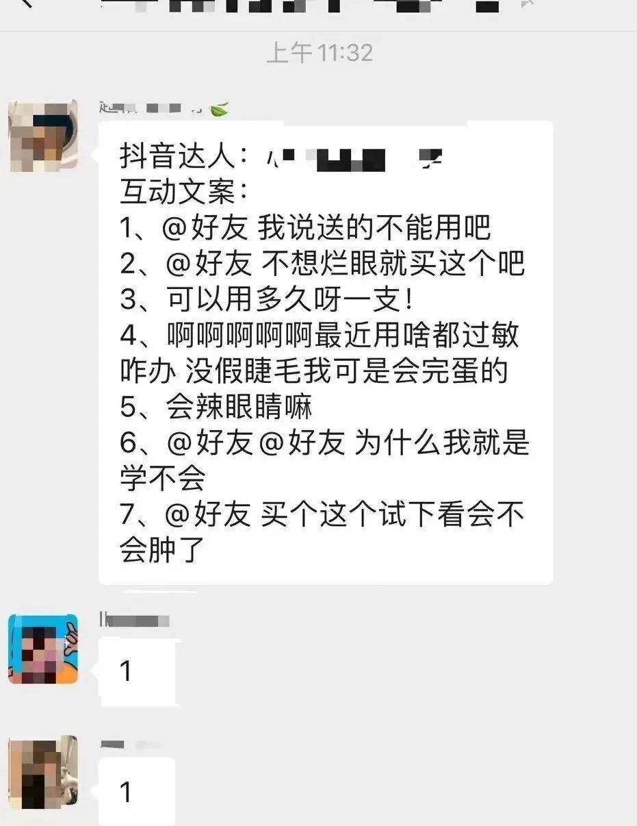 在第三个网络水军群中,水军承担着微博代发的任务,完成一单可赚2元。有水军工头多次提醒:“写评论要有氛围感,不能被人一眼看出是水军。”举个例子来说,在给推广假睫毛的美妆博主写评论时,网络水军常用话术为:“搞得我也想买假睫毛了”“限你两分钟之内告诉我假睫毛店铺”“大眼神器,给我买!”群主将这样的好评文案直接发在群内,大家复制粘贴发布。不过由于参与网络水军的人多,竞争很激烈,赚得最多的网络水军一天也就赚十几元。