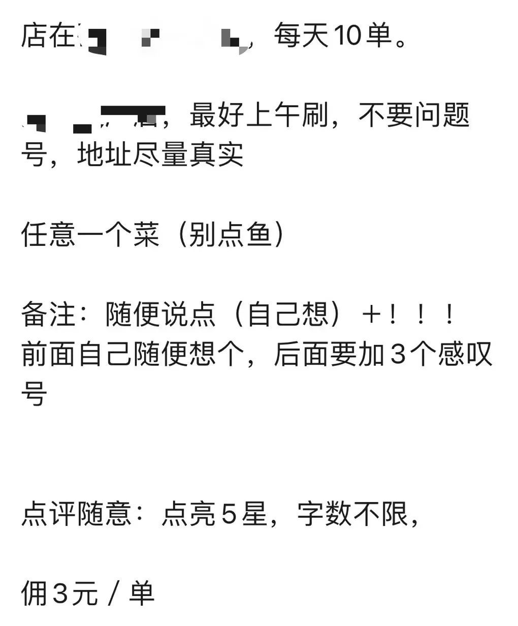 第二个网络水军群中,水军负责给商家刷单。接单前,群主会提醒各位网络水军任务暗号,例如在购买外卖的备注中写上“!!!”。商家看到三个感叹号,就明白这是网络水军下的单,不再配送。一小时后,水军需要在外卖订单上主动点击“确认送达”,随后再点亮五星并写下好评。第二天,群主会将之前垫付的外卖钱退还给刷单的水军,并发放3元酬劳。