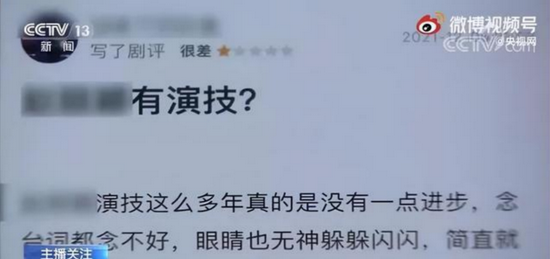 无独有偶,几天后,悬疑剧《谁是凶手》在网上首播,在该剧的前两集中,女主角并没有登场,但前两集播出后,网络社交平台上却出现了大量质疑该女演员演技、台词的论调和一星差评。