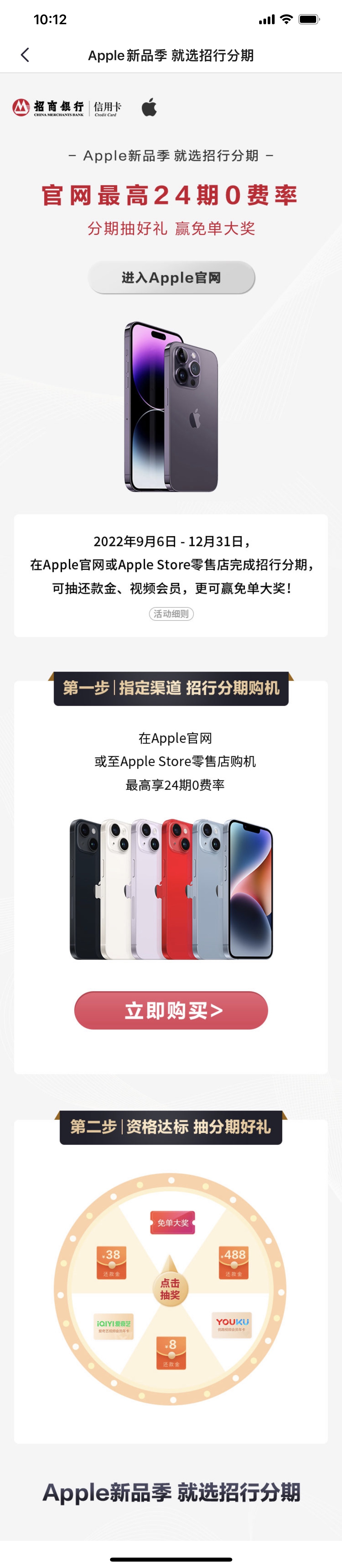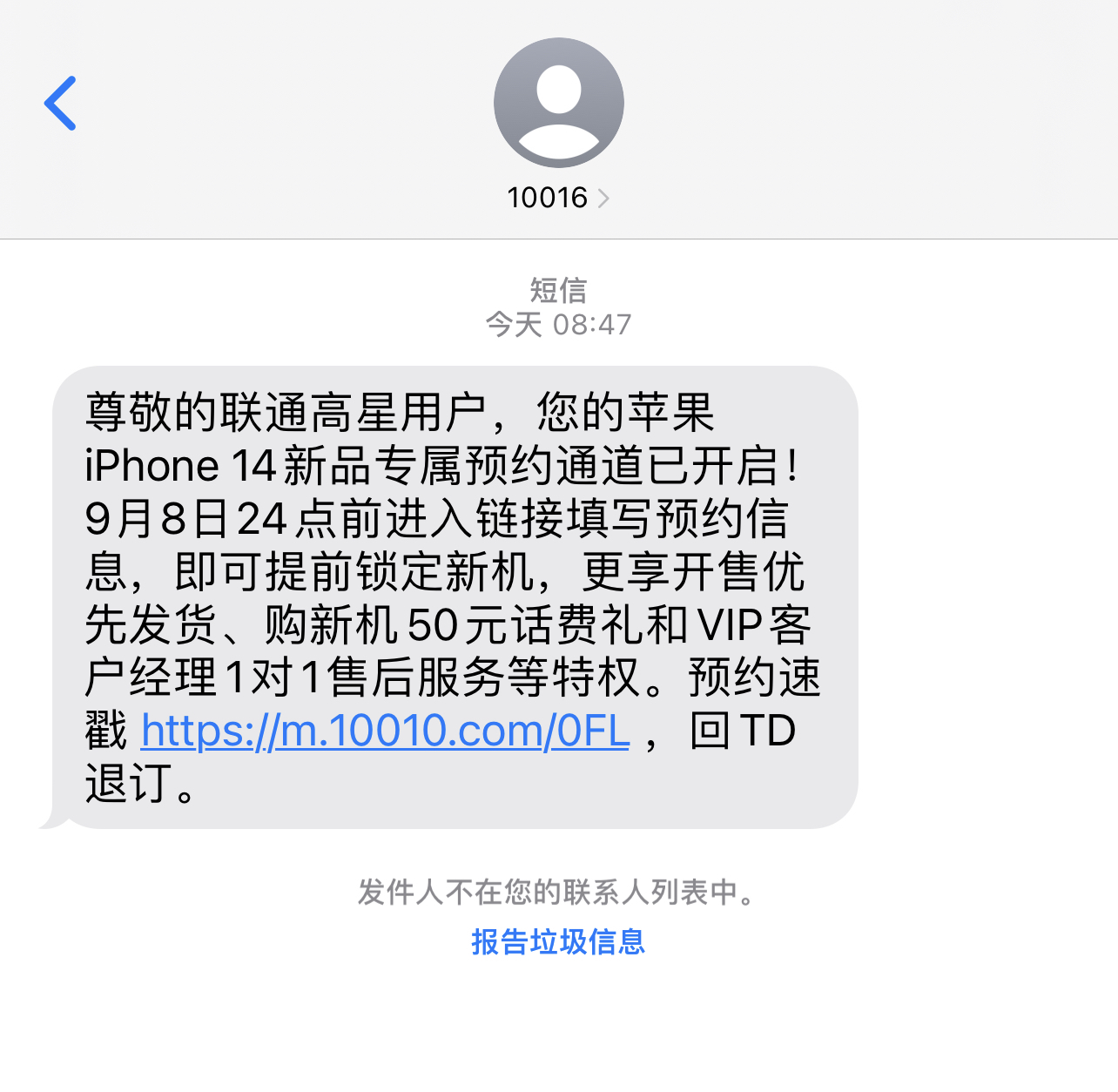 今天一早收到北京联通的短信通知:“苹果iPhone 14新品专属预约通道已开启……”既没提到合约机的事儿,也没提到是否可以免息分期的情况。而招商银行“掌上生活APP”昨天就上线了专题页面做苹果本季所有新品的消费推广,可显诚意。促消费还得看渠道~