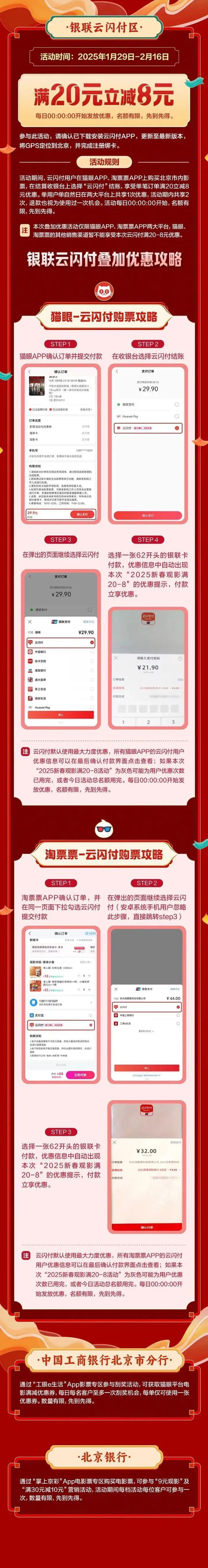 此外,中国银联北京分公司推出在猫眼App、淘票票App结算收银台上叠加支付满减优惠,云闪付用户购买北京市内电影票,单笔满20元订单立减8元,活动期内限2次机会。