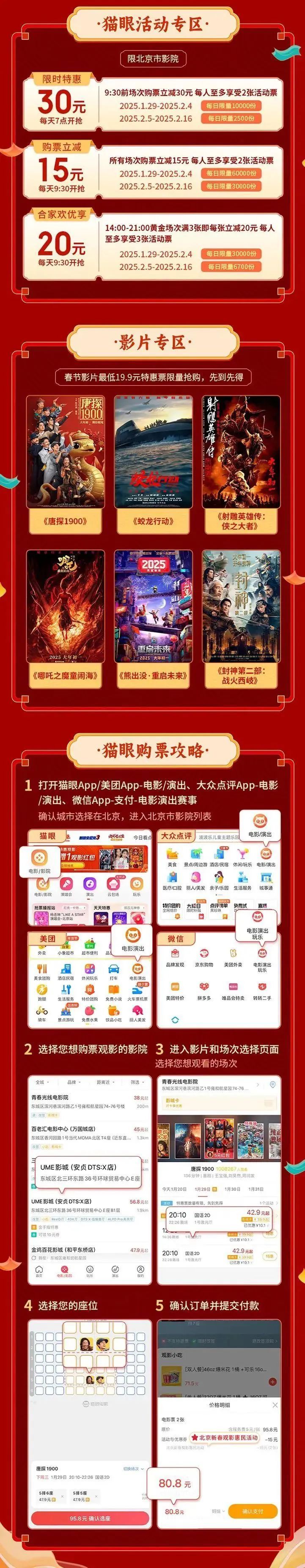活动期间覆盖北京市所有影院所有影片,通过猫眼和淘票票平台购票,用户最低可19.9元观影,单票立减力度2-60元。