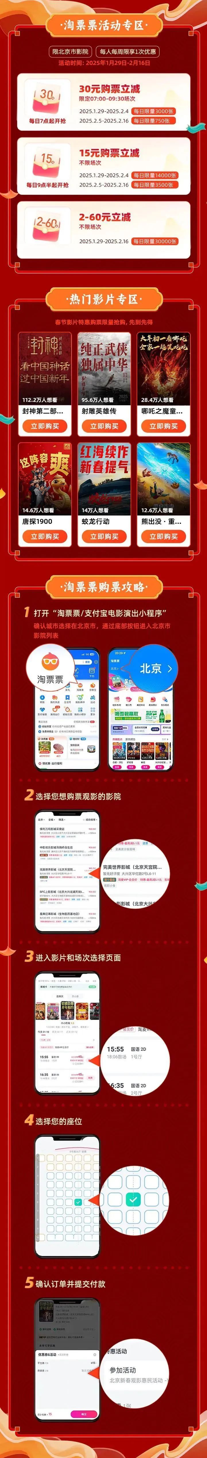 春节期间全市所有时间段覆盖北京市所有影院所有影片,您有机会参与全日立减15元活动。猫眼App每个订单最多可购票2张,淘票票App每个订单最多可购票1张。1月29日(正月初一)至2月4日(正月初七)每天限量74000份,2月5日(正月初八)至2月16日(正月十九)每天限量33500份。