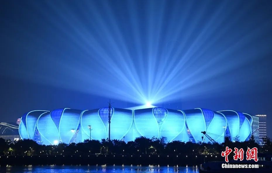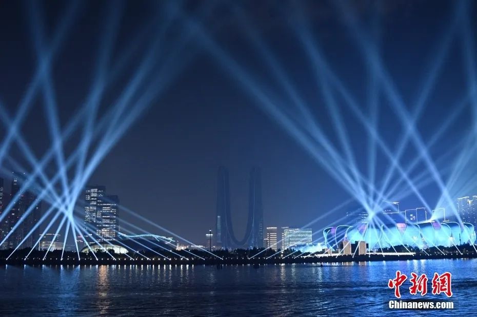 资料图:9月18日,杭州亚运会开幕式演练在浙江杭州奥体中心举行,璀璨灯光秀点亮夜空,美轮美奂。