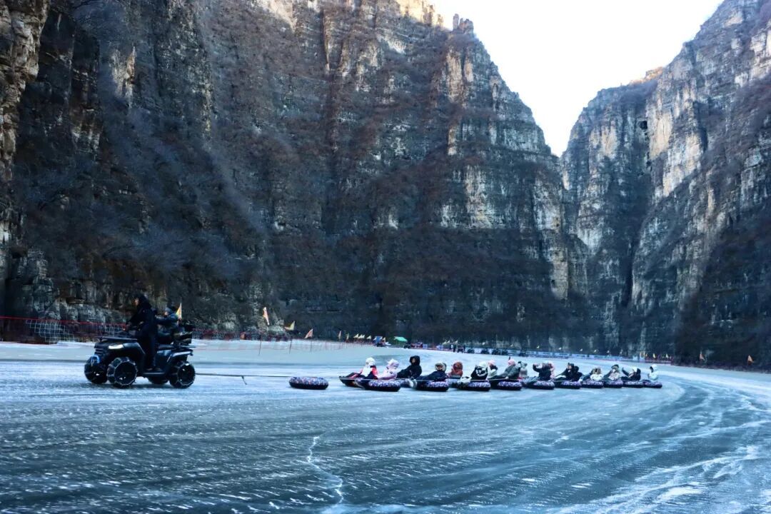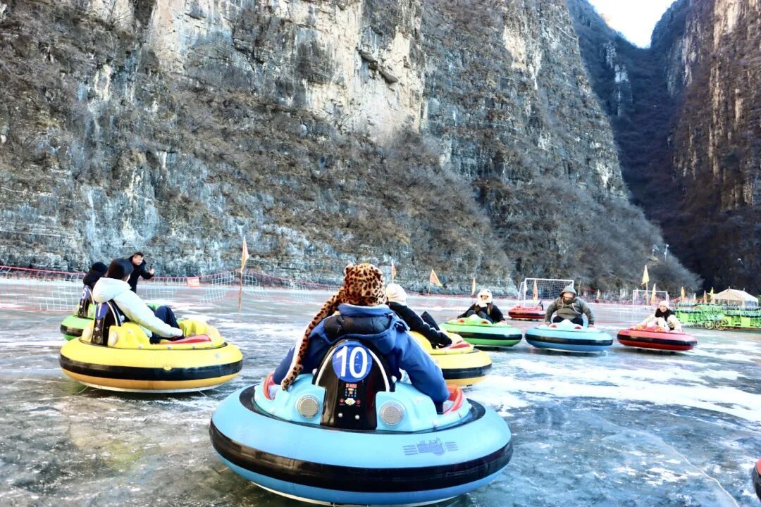 除了气泡冰观赏区,嘉年华区域也已全面开启。往返特色摆渡车、ATV越野车拉雪圈等项目备受欢迎,冰车、冰上自行车、家庭游览车、冰蜘蛛等十余种经典项目分布在冰面各处,游客或单人驰骋、或全家齐上阵,欢声笑语回荡在峡谷之间。