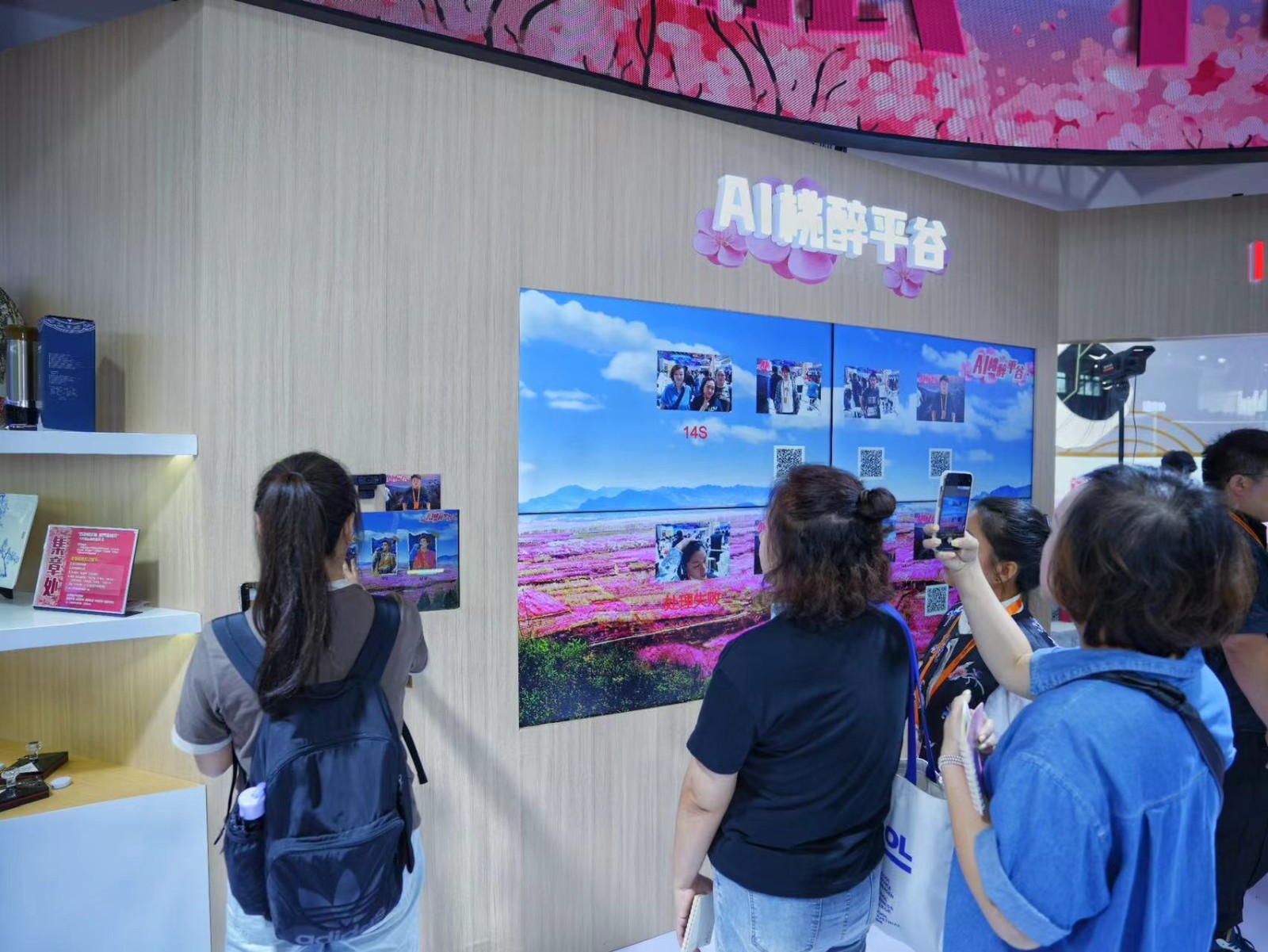 此外,“AI桃醉平谷拍照打卡”也是一大亮点。现场设置的互动大屏为游客提供了“我AI平谷”智能拍照虚拟合成景区相片的机会。游客可以选择八款不同的景区背景进行拍照,即使没有亲临网红打卡地,也能在展区内弥补这一遗憾,带走一份专属于自己的平谷记忆。