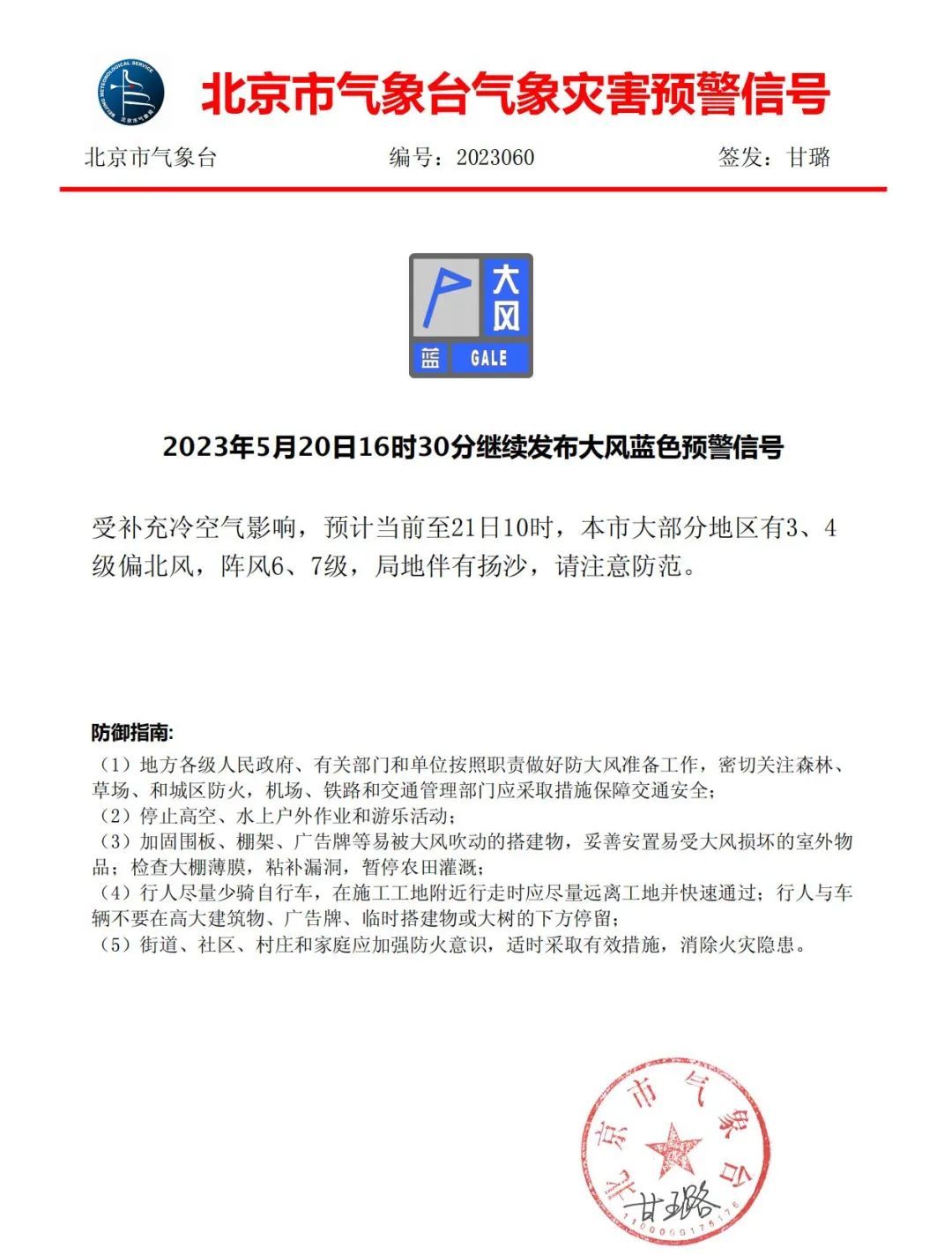 北京市气象台16时30分继续发布大风蓝色预警信号。