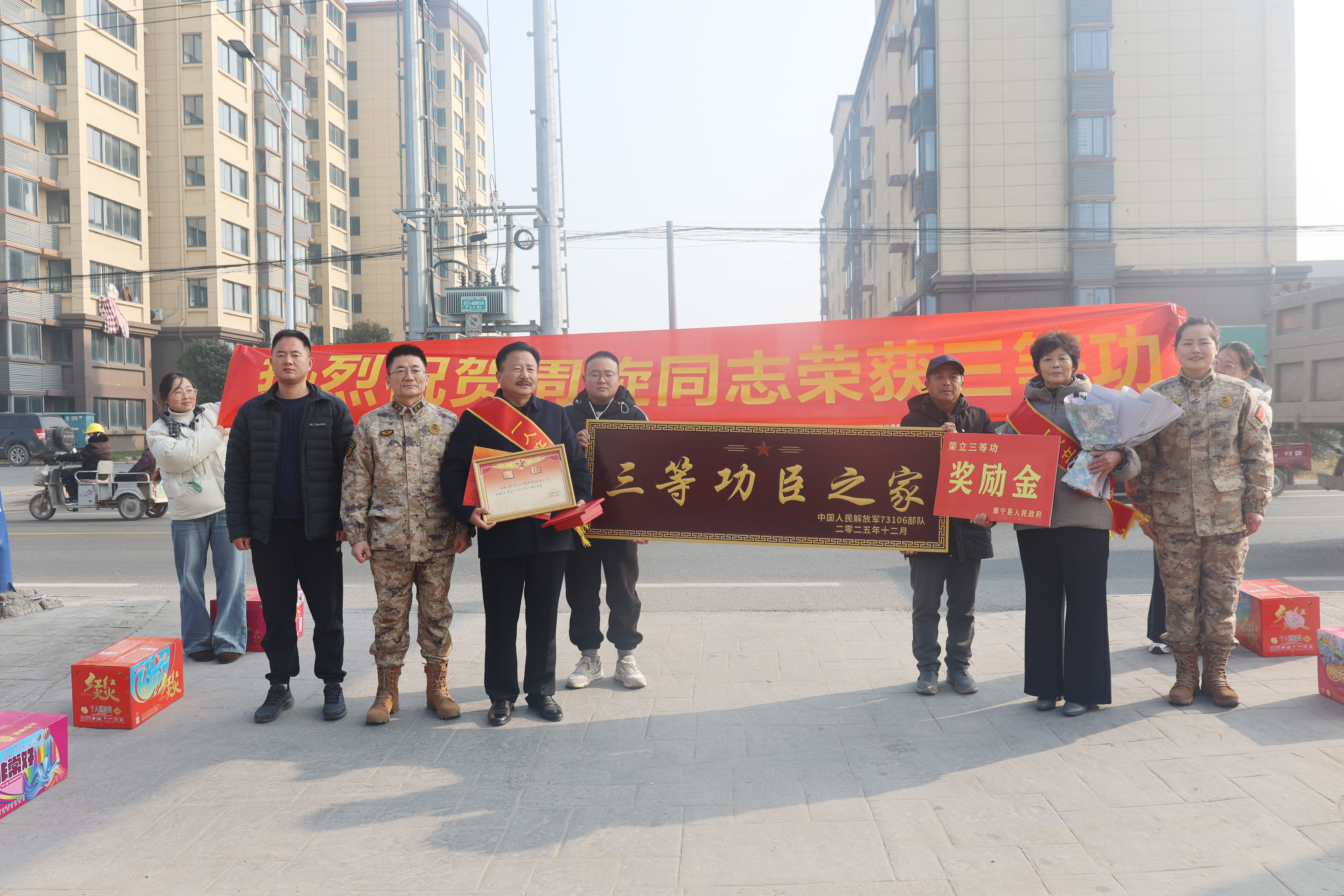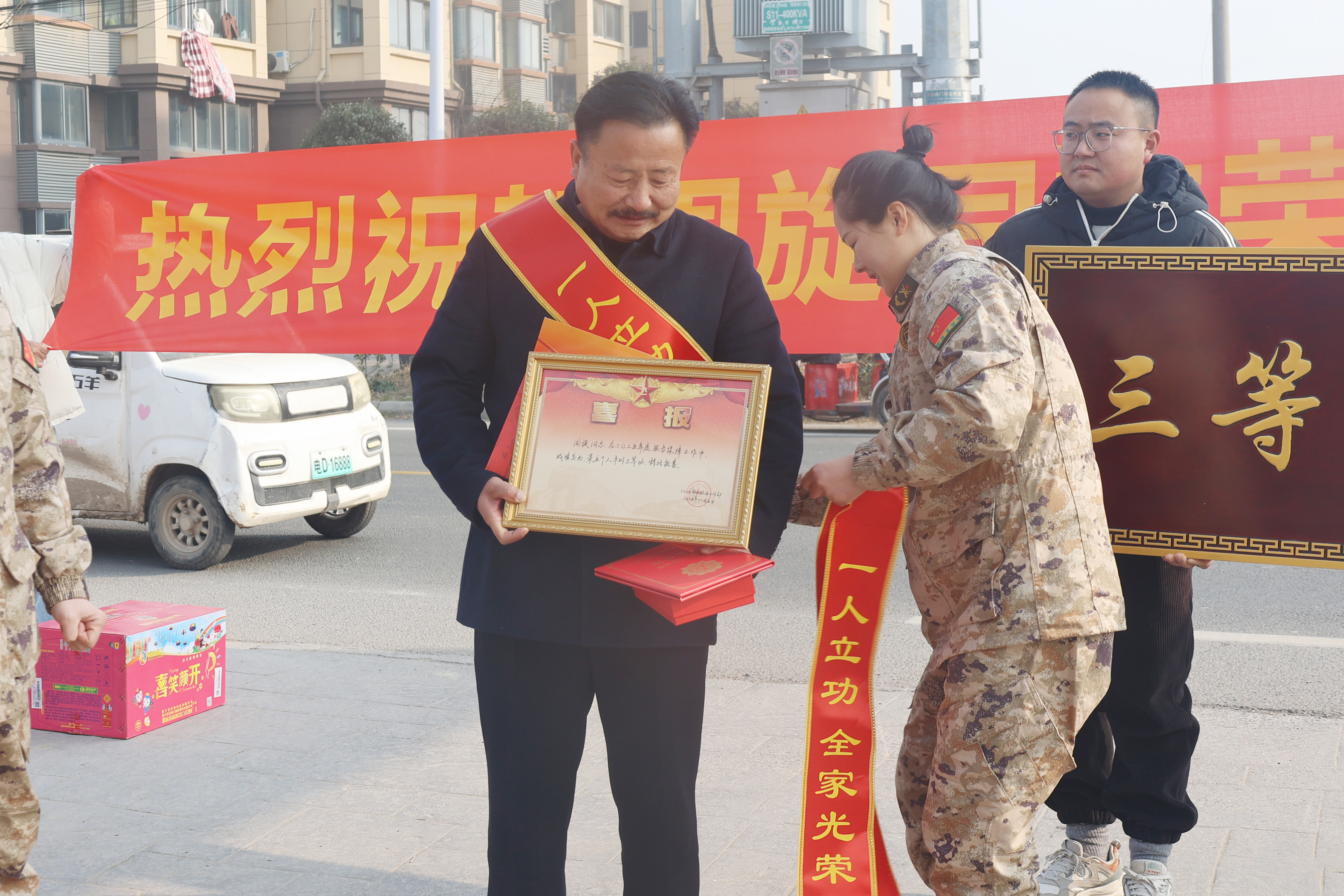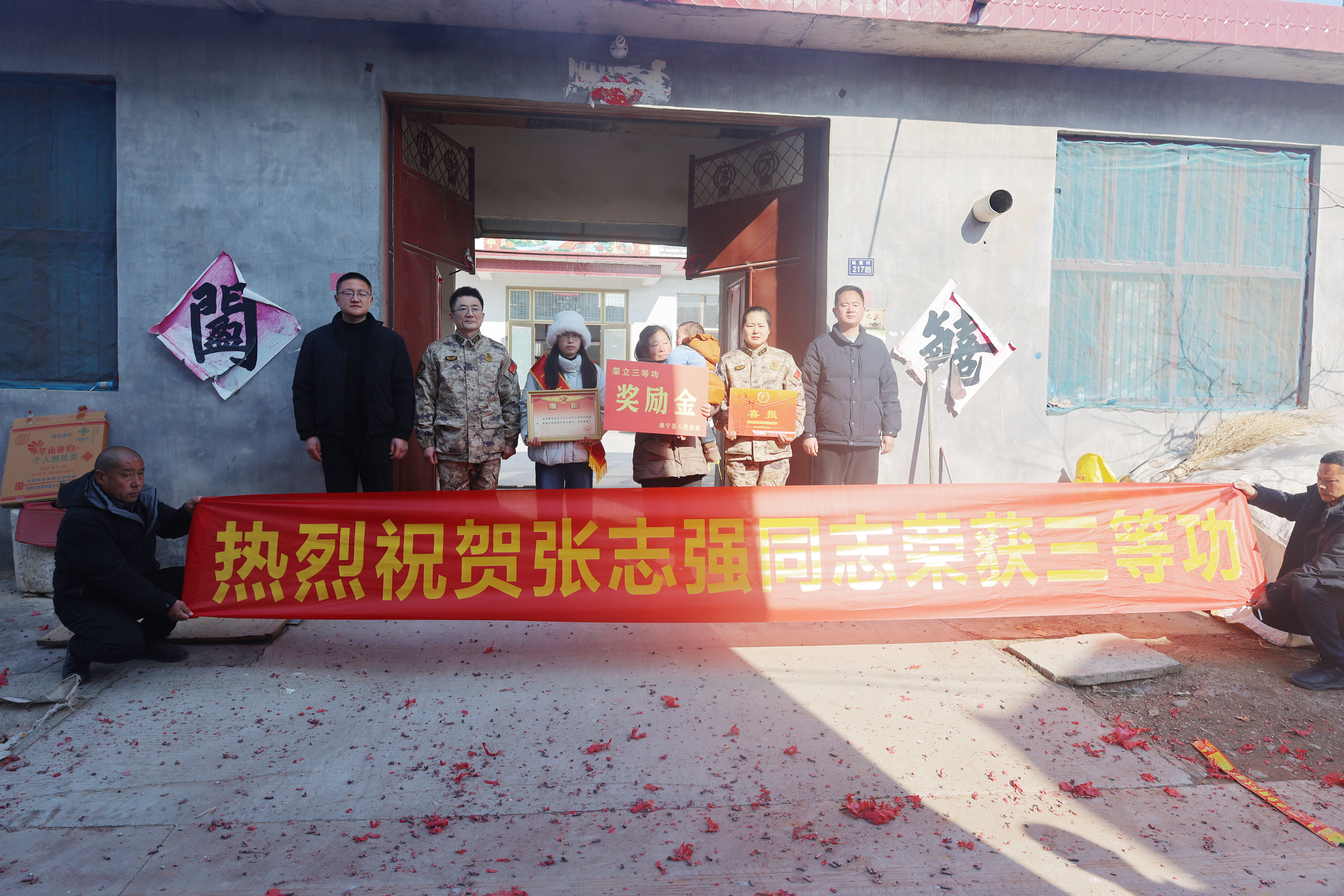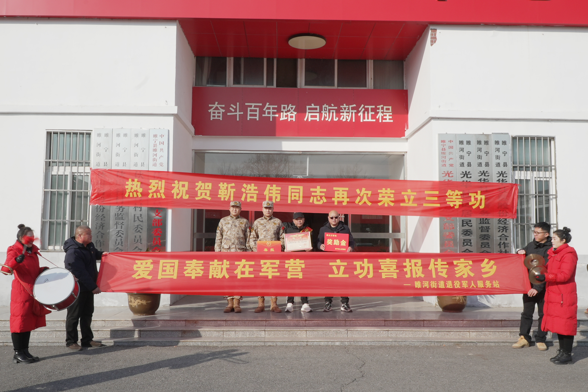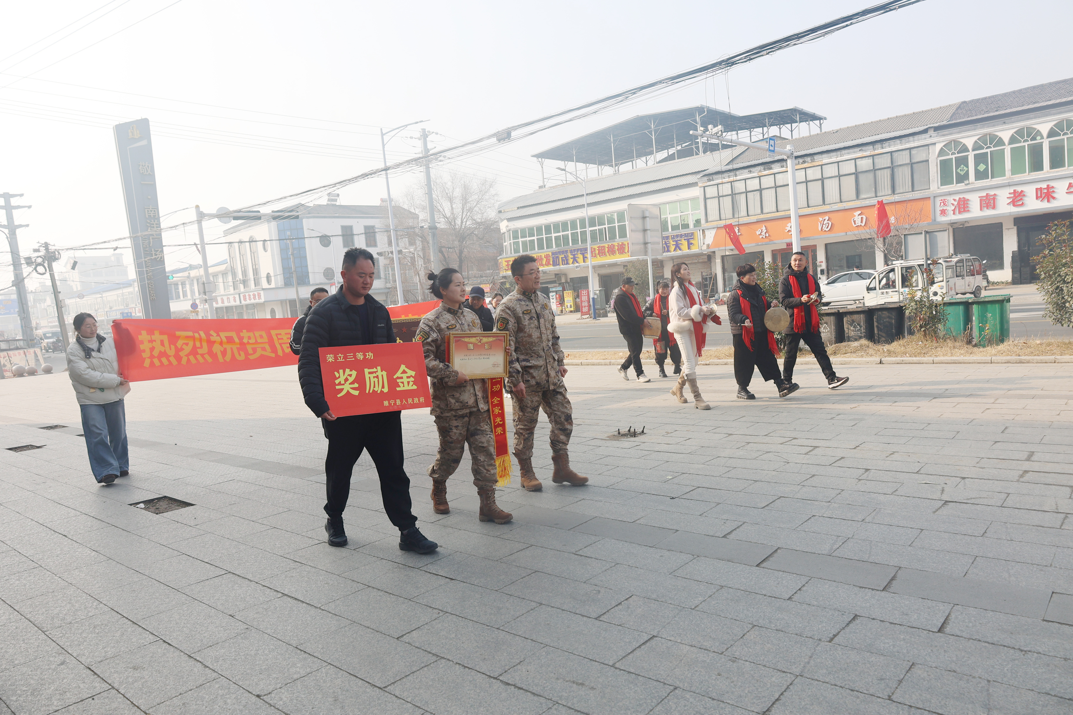近日,睢宁县多地响起激昂锣鼓,王集镇、睢河街道等单位陆续开展送喜报上门活动,将三份三等功喜报分别送到现役军人张志强、靳浩伟、周旋的家属手中,让军人荣誉走进家庭、彰显尊崇,在全社会营造崇军尚武的浓厚氛围。