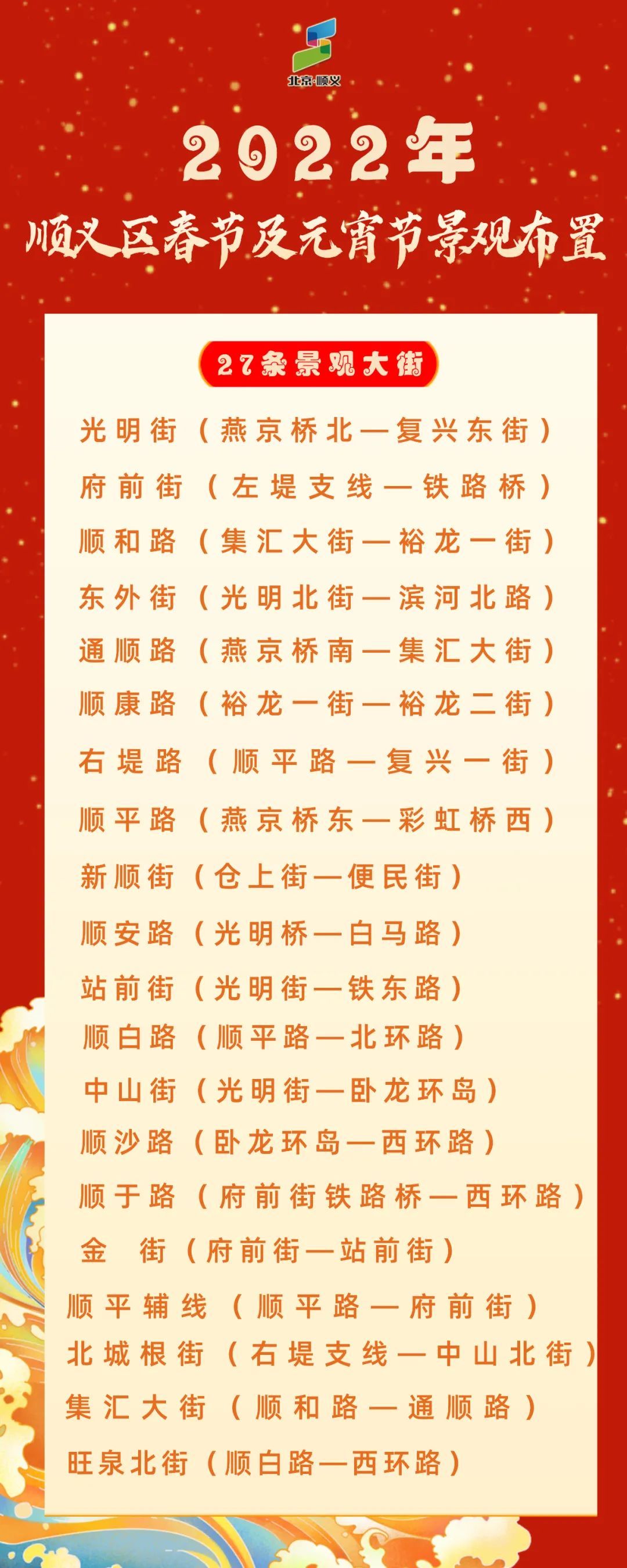 2022年春节将至,为给市民群众营造欢乐、喜庆的节日氛围,日前,顺义区2022年春节及元宵节景观布置工作启动,涉及复兴东街、新顺街、旺泉北街等27条大街和光明文化广场、减河桥、燕京桥等12处景观节点。