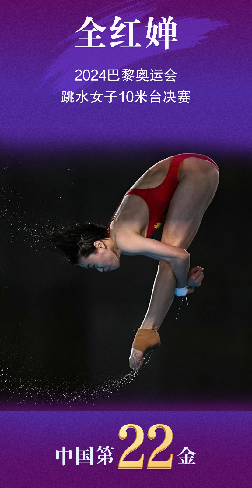 8月6日,在巴黎奥运会跳水女子10米台决赛中,中国选手全红婵夺得金牌,陈芋汐摘银。这枚金牌是中国代表团在本届奥运会获得的第22枚金牌。