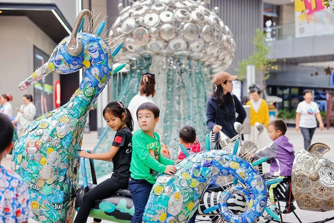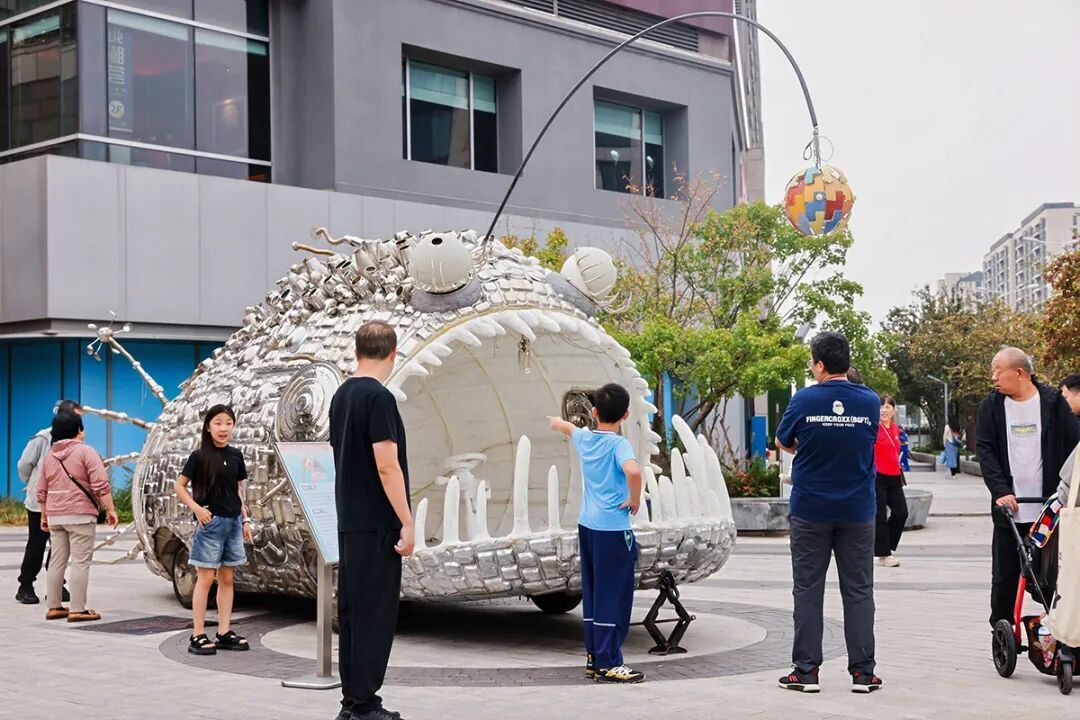 本届户外艺术季邀请以“收集再造”理念闻名的艺术团队“狂荒之地”,将废旧金属打造为大型互动装置艺术群。《海神狂想曲》《海精灵》《嘻皮狂鲨》《灯笼鱼》《摇摇鱼》五大艺术装置分布在小镇内,孩子们可以体验《摇摇鱼》座椅,触摸着由旧零件改造的艺术作品,感受环保与艺术碰撞的智慧。