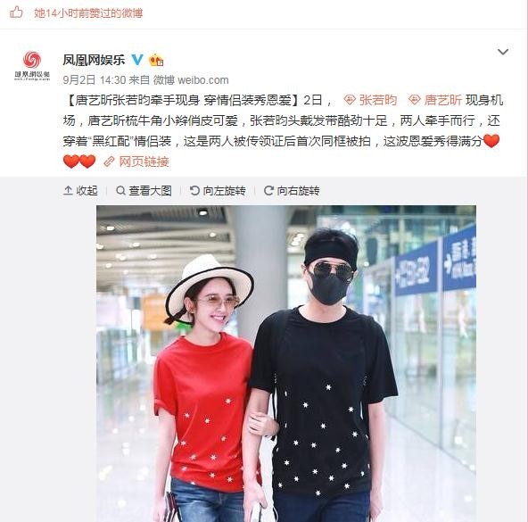 同日,杨紫还点赞了一条关于唐艺昕和张若昀恩爱动态的报道。当天,唐艺昕和张若昀穿情侣装,甜蜜牵手现身机场,这是两人被传领证后首次同框。经过八月分手季,这对恩爱的情侣依然相爱如初,甜skr人。