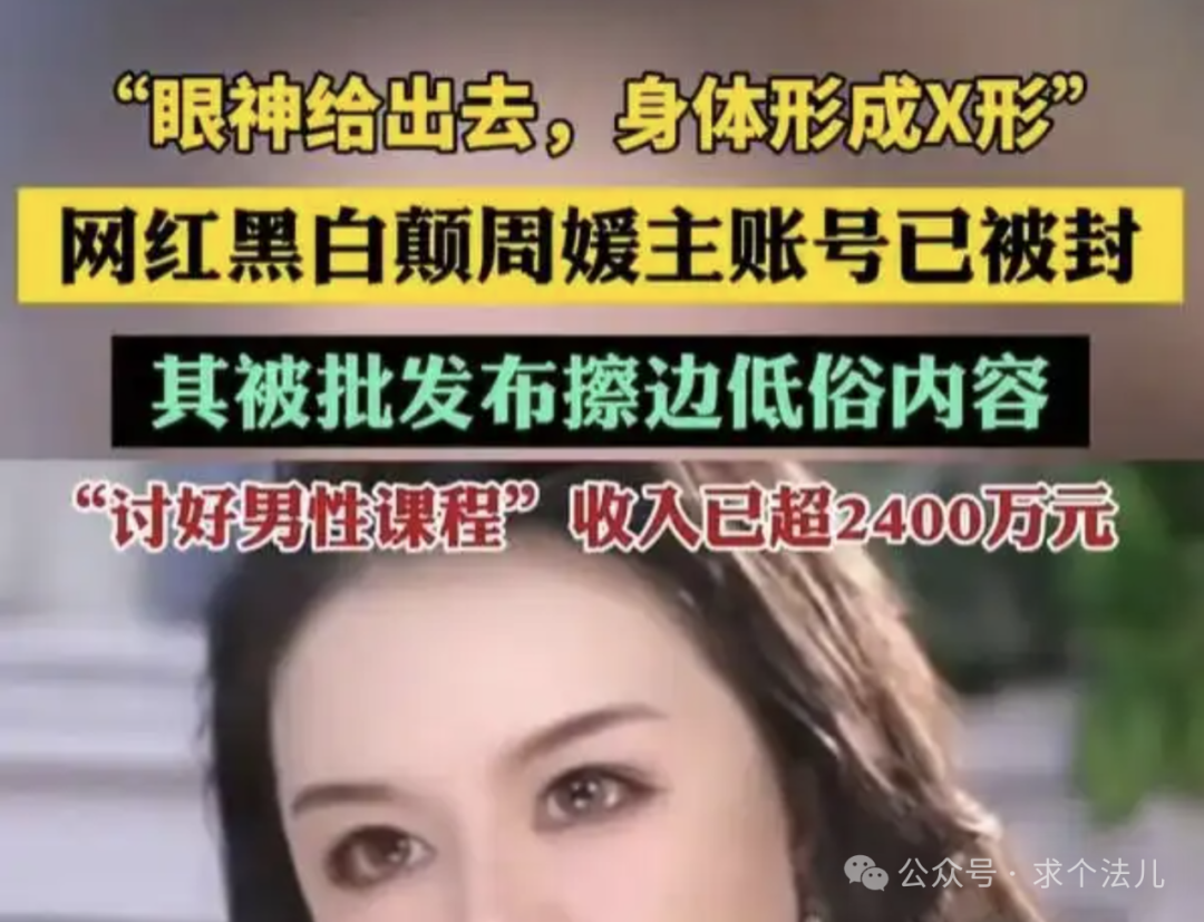 周媛以“黑白颠周媛”为名活跃于短视频平台,自封“性商第一人”,虚构“黑白颠性商学苑”,主打女性“性商提升”课程,收费最高达8.8万元,付费课总收入超2400万元。她通过发布含性暗示的短视频引流,相关言论与动作因低俗化、物化女性引发争议,2026年1月22日,其实名主账号及关联账号均被封禁。