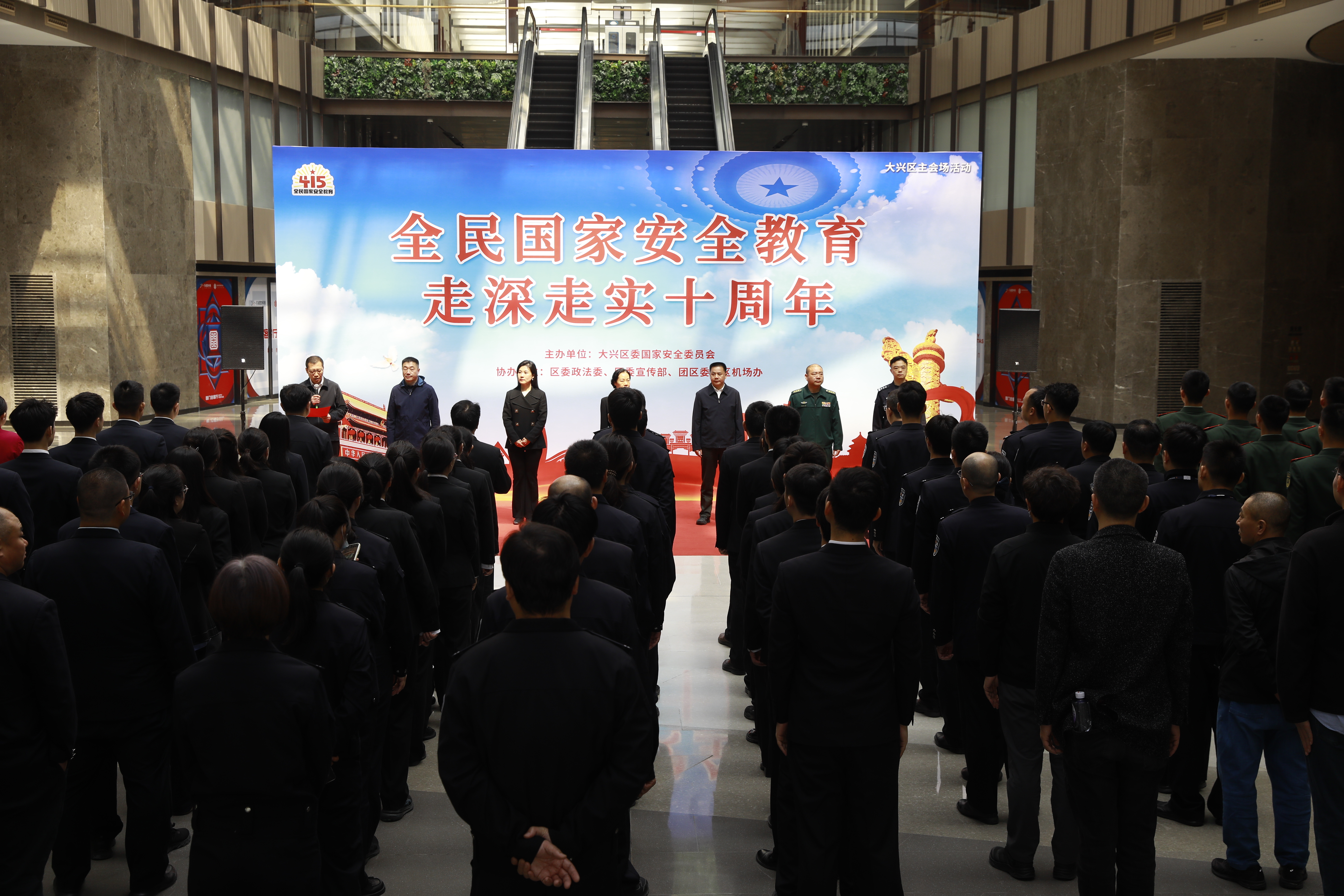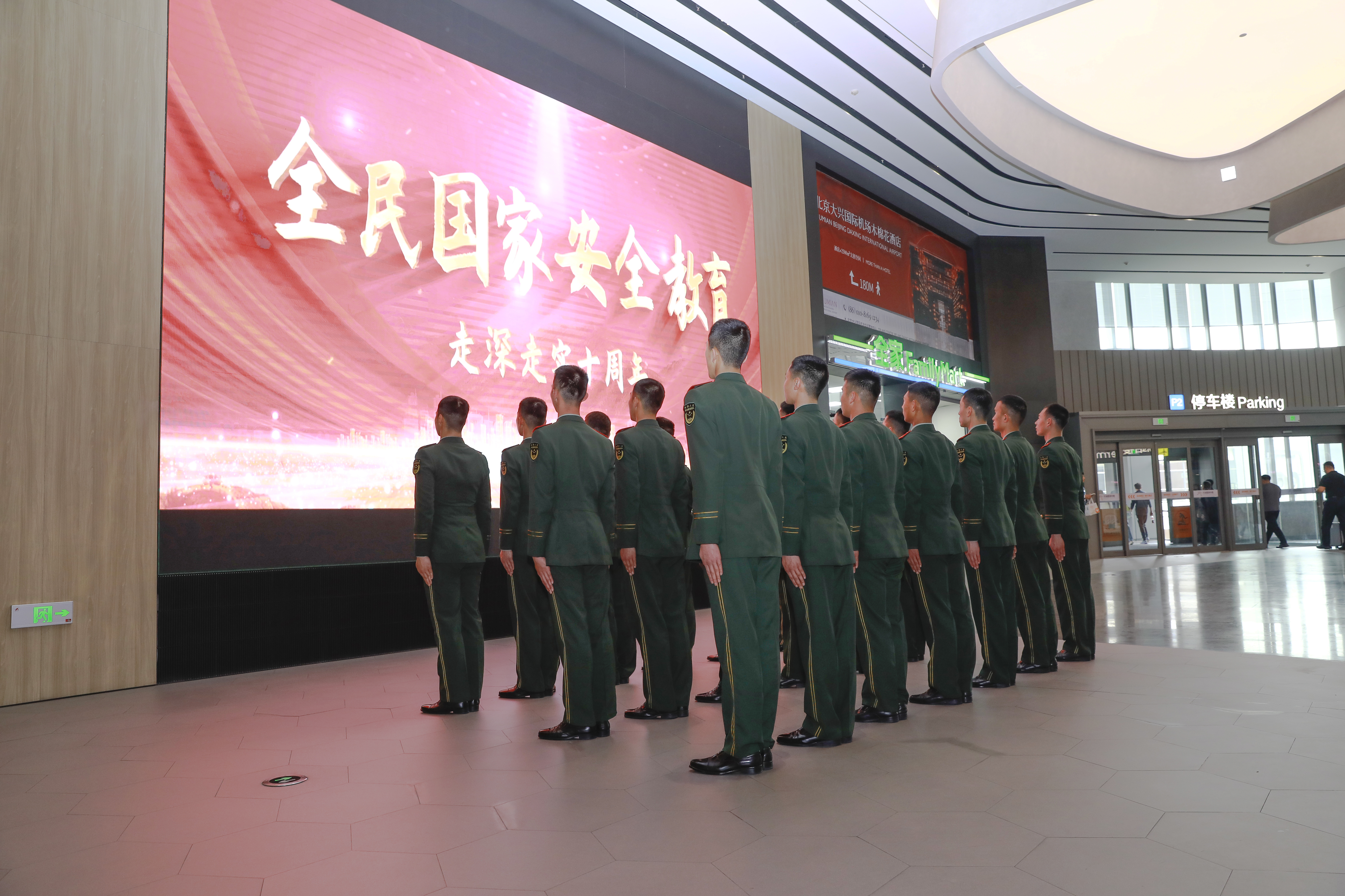 在北京大兴国际机场航站楼里,大兴区举办全民国家安全教育日活动启动仪式,前来参观见学的支队官兵驻足于宣传海报和图片展前,深入了解安全知识,感受安全文化的熏陶。