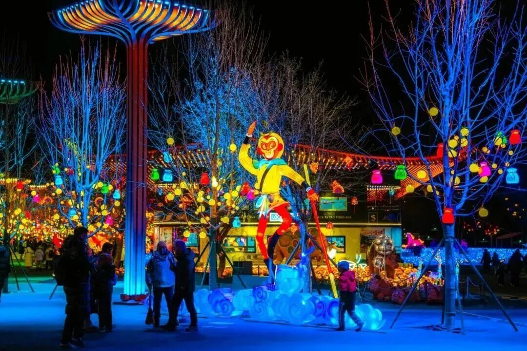 2026世园花灯艺术节联动上海美术电影制片厂有限公司经典作品《大闹天宫》,展示50余组大型花灯,游览路线长达2.5公里。这其中大部分花灯组以动画电影《大闹天宫》为蓝本设计制作,让游客在游玩过程中产生深刻共鸣、感受中华文化的魅力。