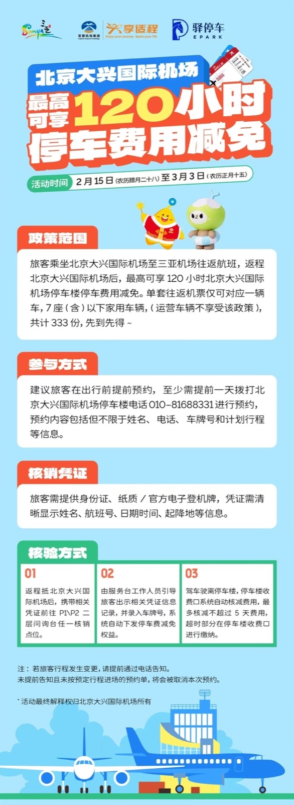 2026年2月15日(农历腊月二十八)至3月3日(农历正月十五)期间,凡持大兴机场至三亚机场往返航班机票的旅客,均可通过提前预约、返程核销的方式,享受大兴机场停车楼最高120小时的停车费用减免服务。