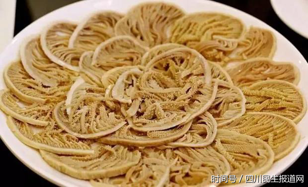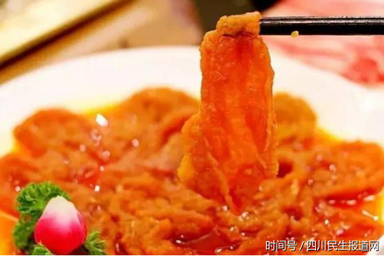 (九香千层肚:将马肚煮熟后洗净,切成3mm的薄片。在煮沸的火锅中煮2分钟,千万不能煮太久哟,不然变韧了就不好吃了)