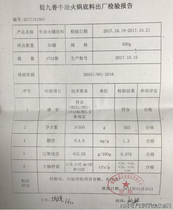 (蜀九香牛油火锅底料严格经过检验,确保每项指标达标)