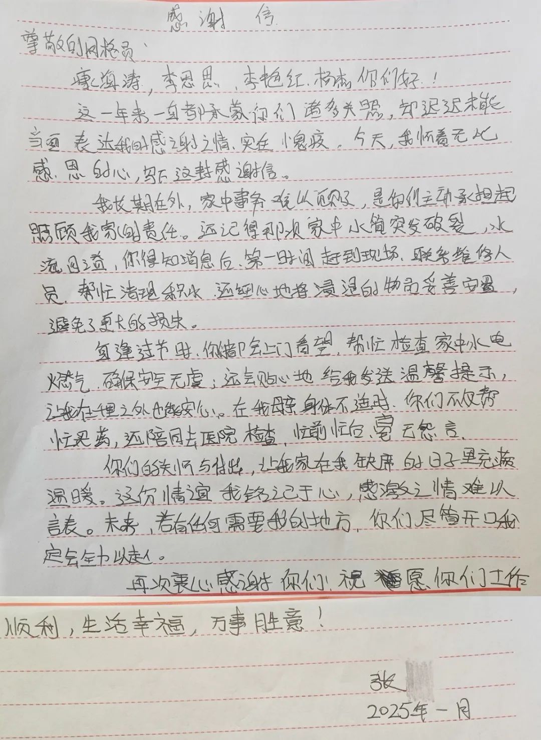 杜女士生活上的琐事,网格员也照顾得十分周到。换煤气罐、购买药品、陪同去医院看病……李思思说:“其实我们做的都是些小事,能帮到杜阿姨,我们心里也高兴。”直到收到张先生送来的感谢信和锦旗,他们才真切知晓这些点滴在村民心中的分量。信中的每一个字,都满含着感激与信任。