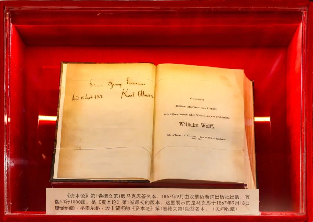 《资本论》第1卷德文第1版马克思签名本。1867年9月由汉堡迈斯纳出版社出版,首版印行1000册,是《资本论》第1卷最初的版本。这里展示的是马克思于1867年9月18日赠给约翰·格奥尔格·埃卡留斯的《资本论》第1卷德文第1版签名本。(民间收藏)