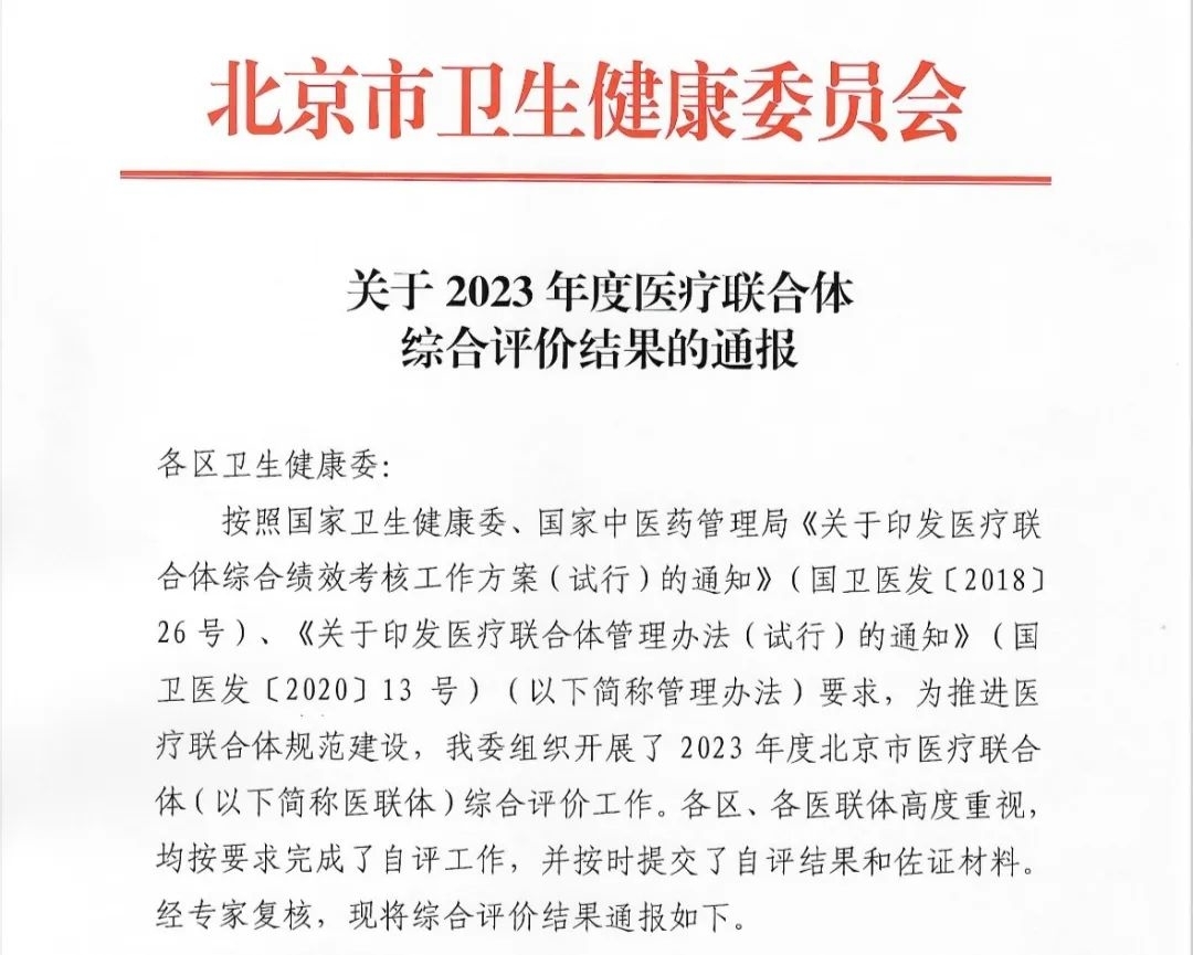石景山医院荣获北京市卫健委医联体综合评价北京市第一名