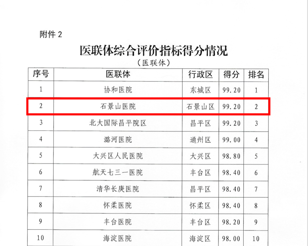 近日,北京市卫生健康委员会发布《关于2023年度医疗联合体综合评价结果的通报》,石景山医院以99.20的优异成绩在全北京市62家综合医院中脱颖而出,与北京协和医院、北京大学国际医院并列北京市第一名,同时也是石景山区三家核心医院第一名。