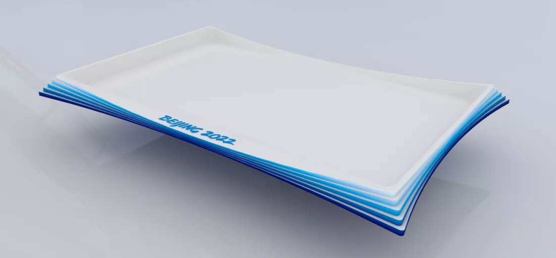 造型似打开的书页,寓意通过北京冬奥会向世界翻开了中国文化和各国友好的新篇。托盘边缘采用蓝白渐变的设计,呈现出“晕染”的东方美学意境,象征着中国文化与世界文化的交融,体现了中国开放、友好、和平、包容的心胸。