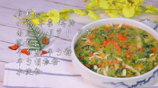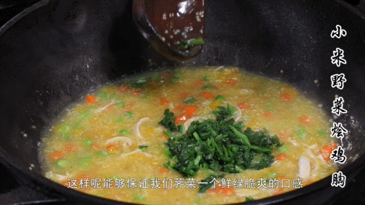 完成:临出锅加入提前焯水的荠菜,再次烧开,这道减脂瘦身版的小米野菜烩鸡胸,完成~