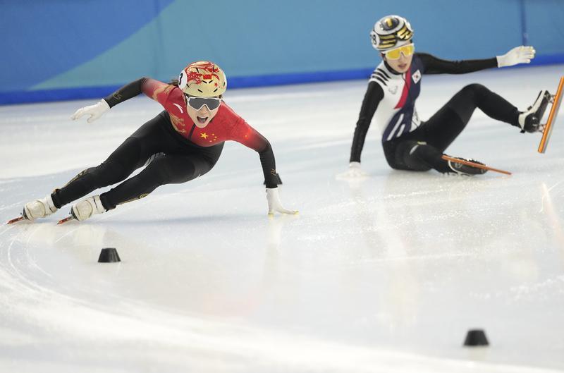 2月9日,中国队选手公俐(左)在比赛中冲刺,韩国队选手金吉莉在比赛中摔倒。新华社记者 颜麟蕴 摄