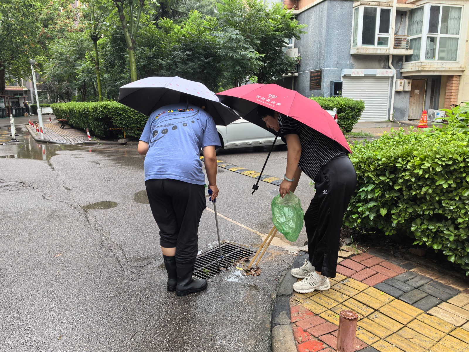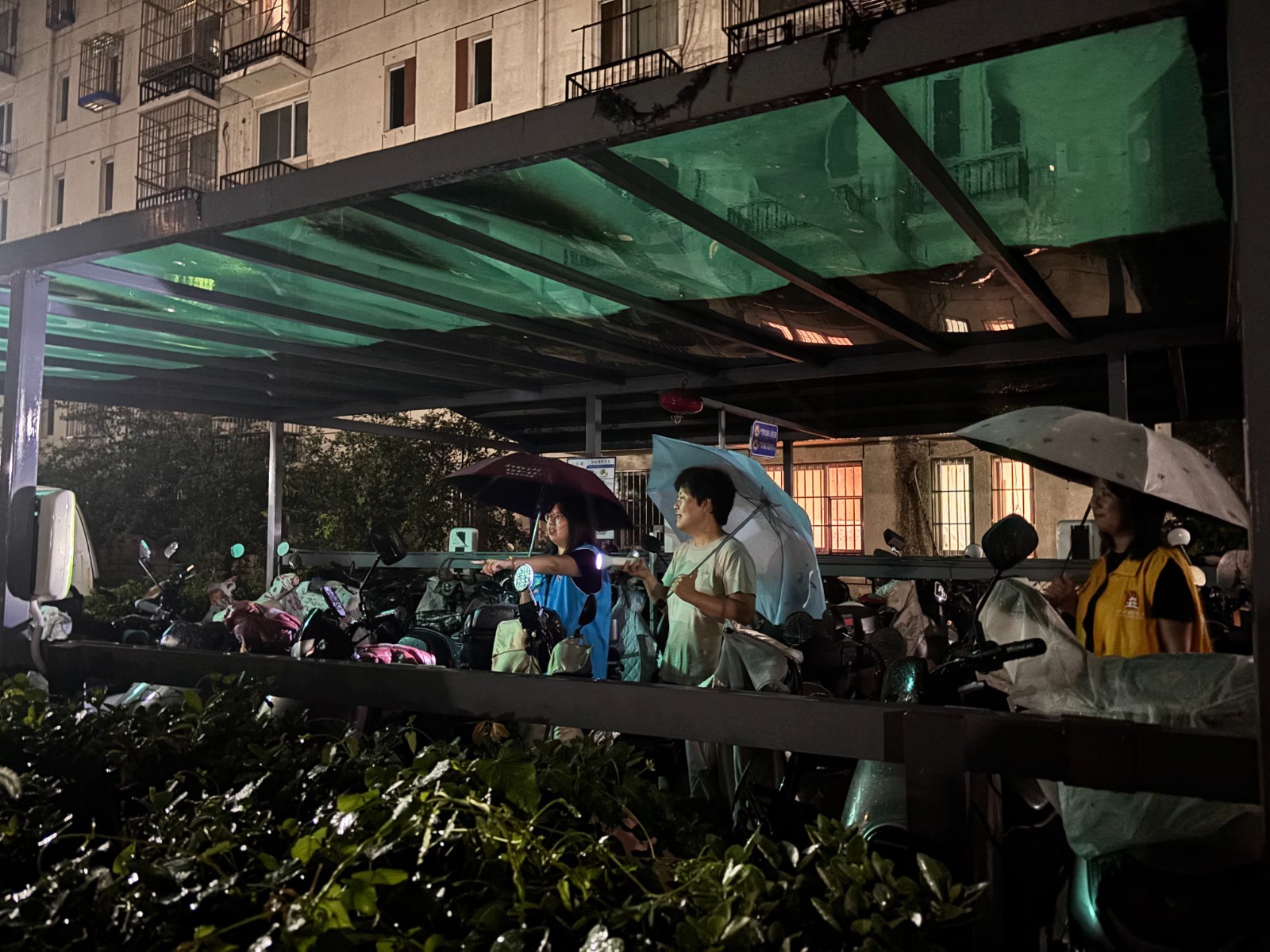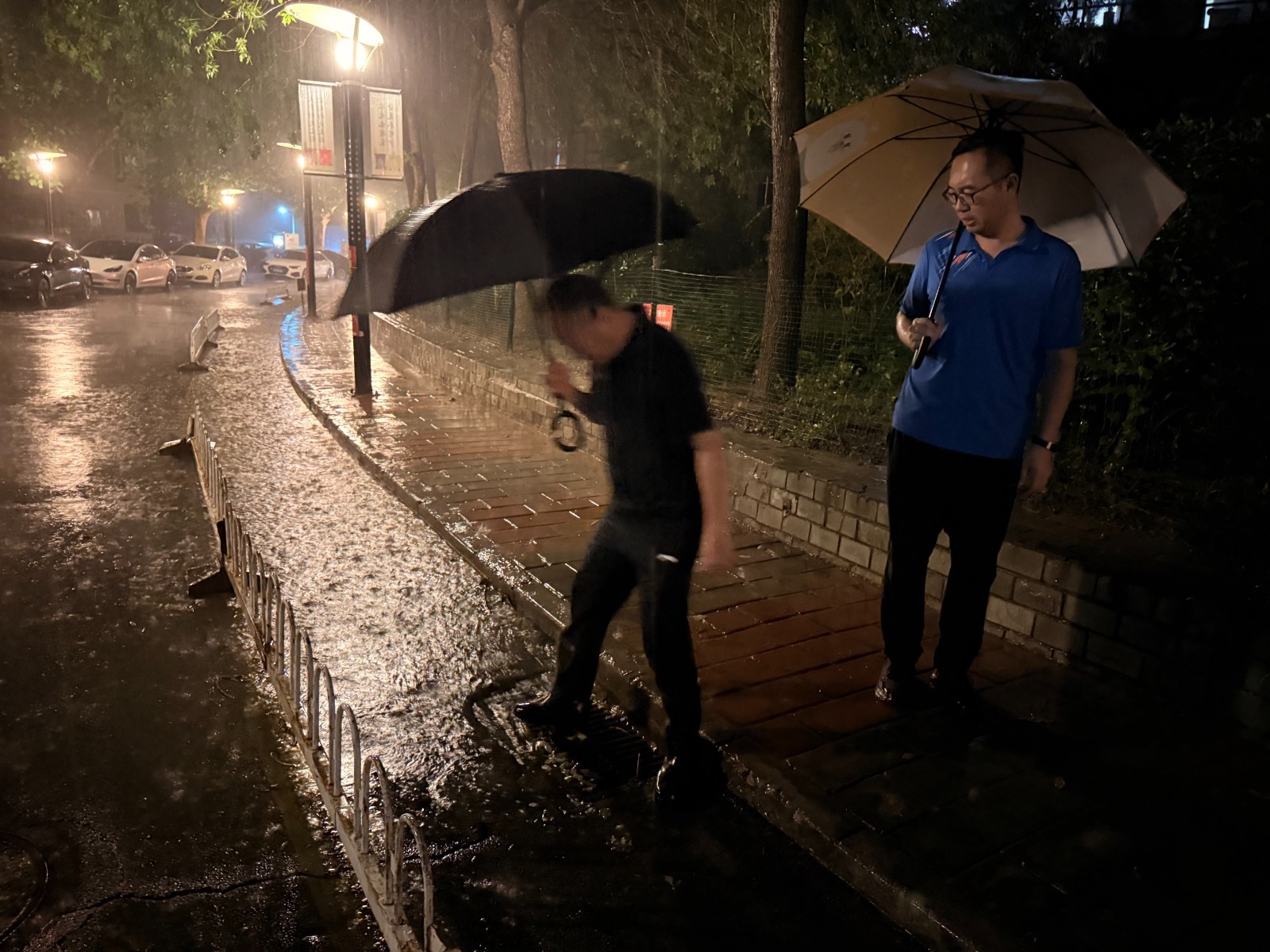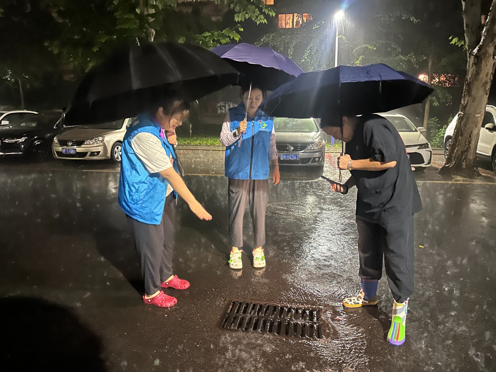 他们蹚着积水,逐段排查辖区主要道路积水情况;打着手电,仔细检查每一个雨水箅子的通畅程度;冒着大雨,反复巡查并清理地下空间和楼顶排水状况。同时逐一检查加装电梯安全隐患、密切监控河道水位变化,随时准备采取应对措施。在充电车棚内,巡查人员反复确认设备安全,对低洼院落和坑洼路段,安排专人值守并设置警示标志。