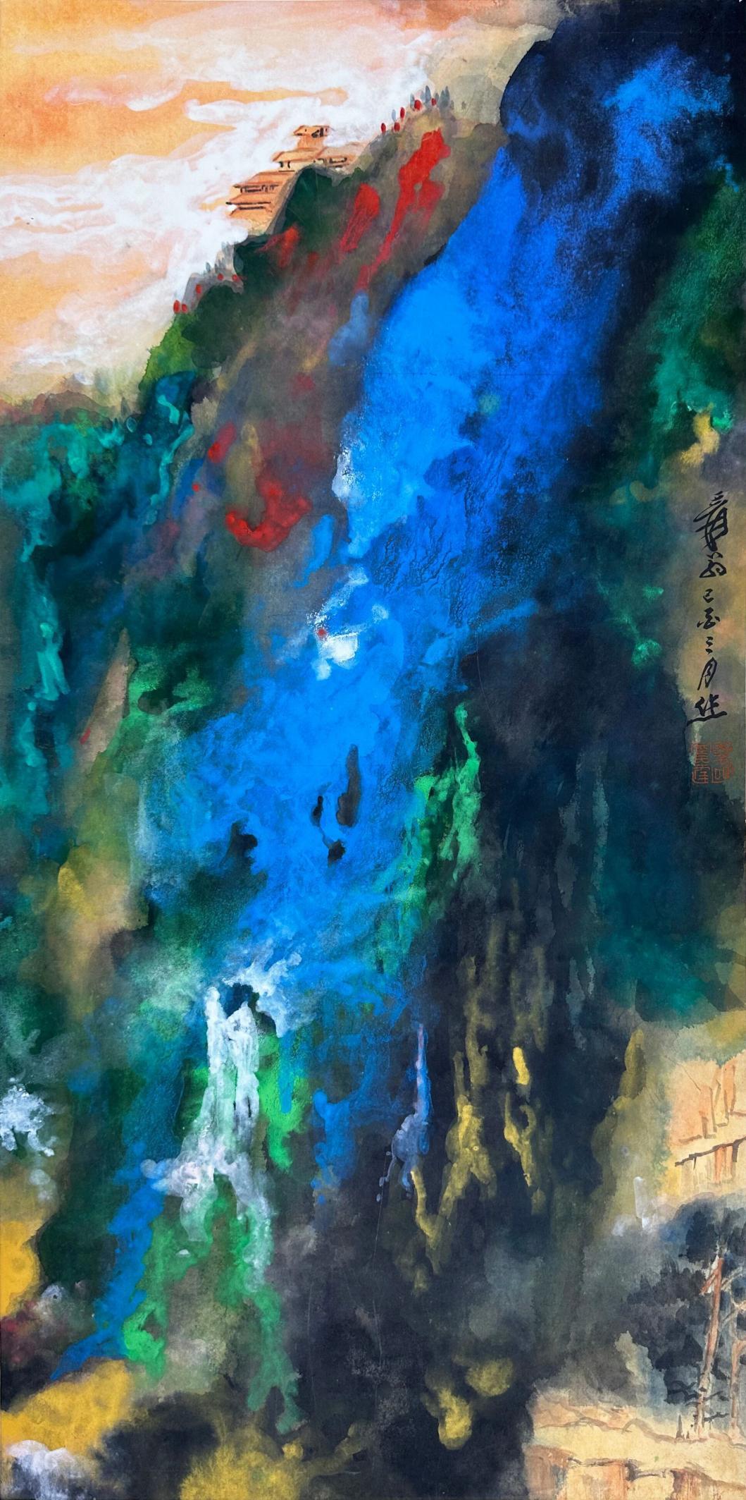 今天,当我们驻足于张大千的泼彩画前,依然能被那种磅礴的气势与细腻的情感所震撼。那些流动的色彩与墨韵,仿佛还在诉说着艺术家的激情与哲思。张大千以他非凡的勇气与智慧,打通了传统与现代的壁垒,为中国画开辟了一条充满可能性的新路。张大千泼彩山水的视觉力量,根本上源自他打通古今与中西的创造性转化。他将中国传统的泼墨、青绿山水精神,与西方现代艺术的抽象表现和色光理念相结合,在偶然与控制的平衡中,开创出既具国际现代感、又深植东方美学根脉的新山水图式。在泼彩的混沌与秩序之间,我们看到了一个艺术家的真诚探索,更看到了中国文化的强大生命力。这或许就是张大千留给我们最宝贵的遗产——艺术的真谛不在于固守成规,而在于在尊重传统的同时,勇敢地开创属于这个时代的美学表达。