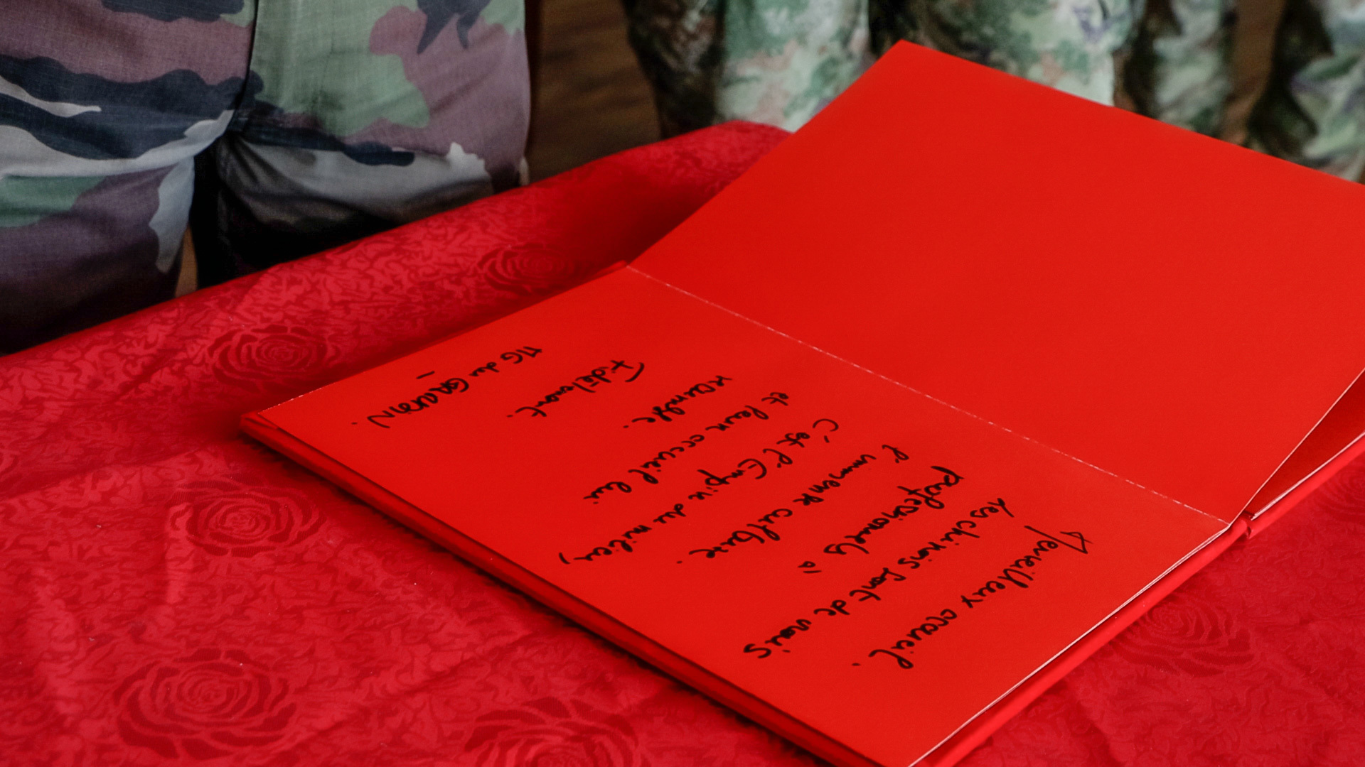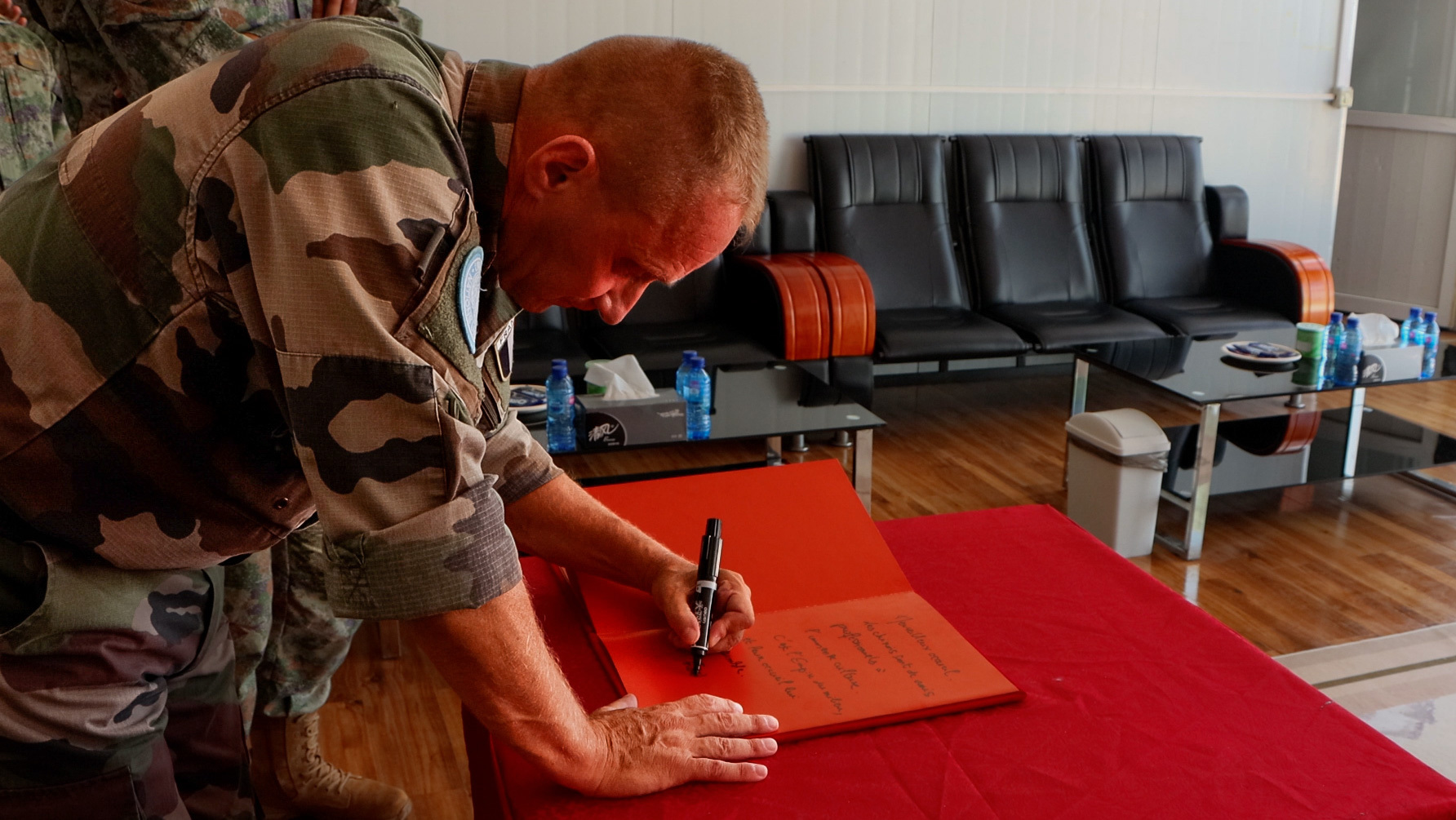 接着,杜加丁参谋长在中国文化帐篷慰问了多功能分队全体官兵,并发表热情洋溢的致辞。他说:我作为参谋长而言,我个人更依赖于我们中国军人,我发自内心的尊重中国军人,因为中国军人的谨慎、专业、敬业,尤其是你们的纪律性更是值得尊重。中国是一个古老的帝国,在西方国家之前中国已经是繁荣昌盛的国家,中国拥有着未来,也就是说中国拥有着世界的未来。我不知道将来黎巴嫩的局势将如何演变,但我知道在战后的行动中,中国分队将是至关重要的。如果下一步我们要重返南线,重新观察南线的局势,那么首要的将是有一个通往南线的通道,而这也是需要我们中国分队来提供这个通道。如果能重新获得和平,我们将是第一个执行任务的人……再一次非常感谢大家,为你们感到骄傲!访问结束后,杜加丁参谋长还为多功能工兵分队亲笔题词:这是一次很棒的访问,中国军人展现了深厚的文化底蕴和专业性,是当之无愧的世界大国。