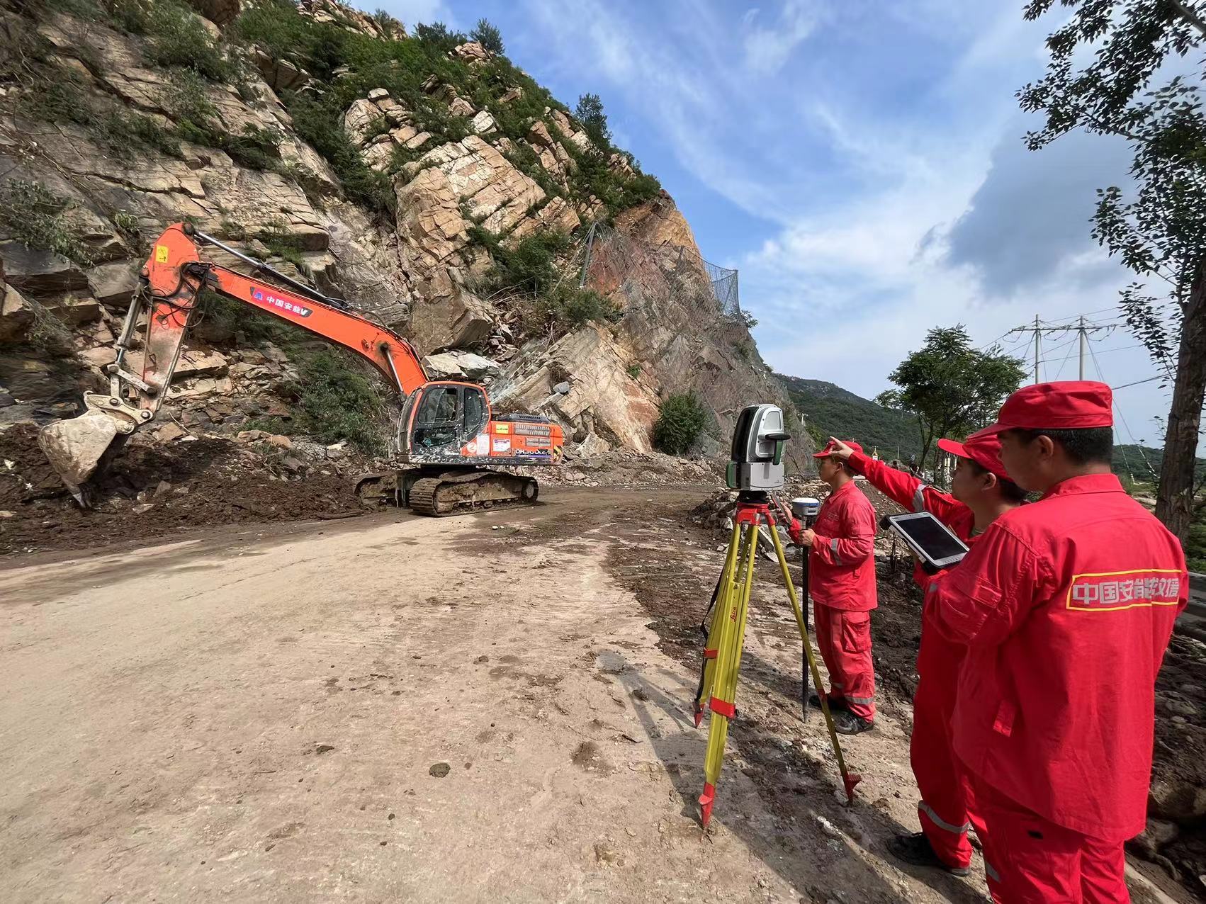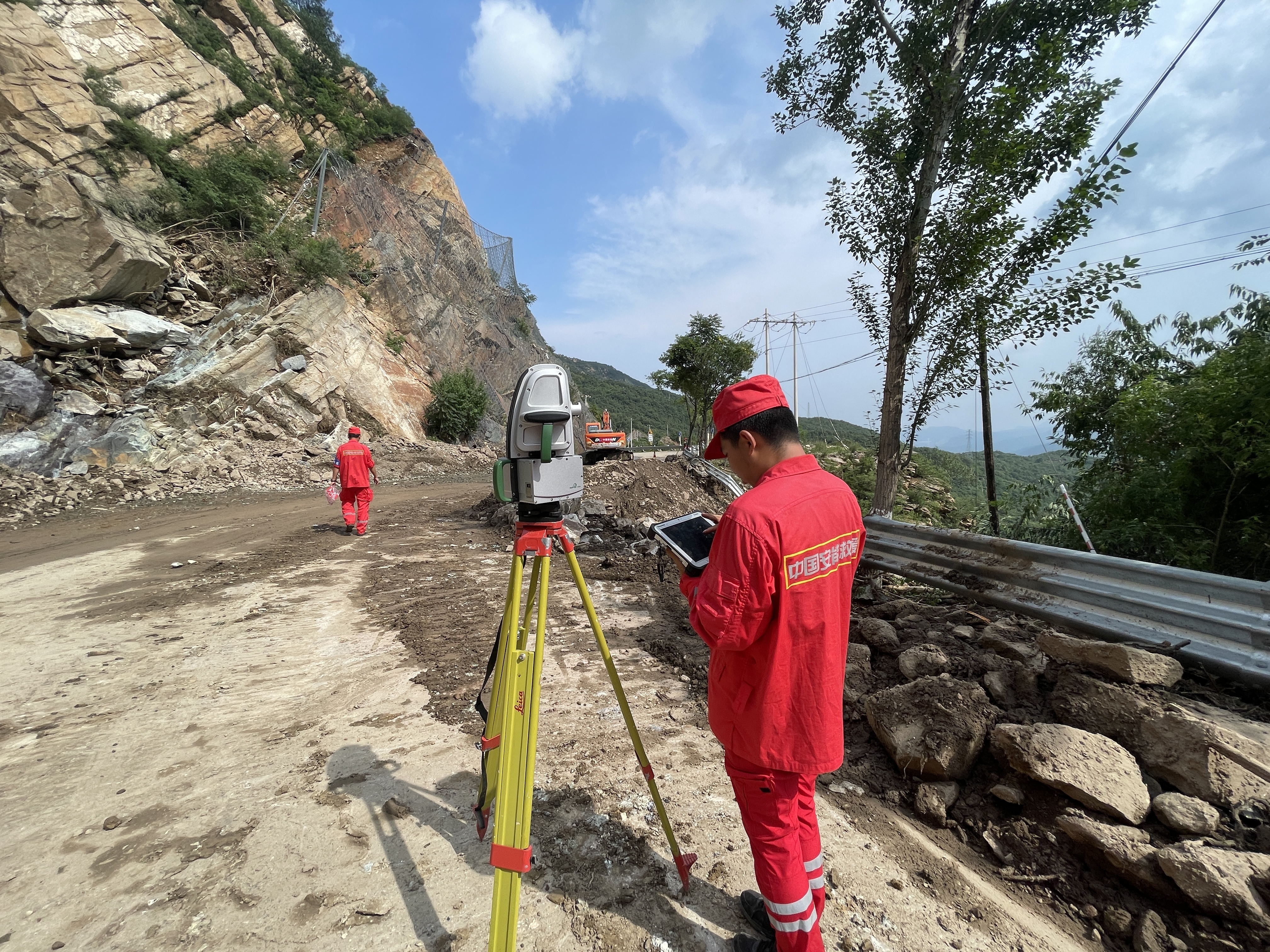 门头沟G234国道潭王段山区道路地形情况复杂,路基掏空、塌方处边坡不稳定,中国安能专业救援力量利用三维激光扫描仪、地质雷达、全站仪等高精尖装备加强边坡监测,搞好安全防护,防范山体二次塌方。目前,道路抢修还在紧张进行中。