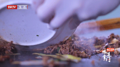 腌制后的牛肉直接放在炙热的炙子上,还不等牛肉反应过来便已经熟了三成,这样便可最大限度锁住牛肉的鲜香。烤肉师傅采用木夹,配合盘子不断地翻炒,让肉的每一面都能均匀受热。只需几分钟,肉香、酱香、葱香,加上香菜和木炭的木香,几种香型便在烤肉间弥漫开来,最终混合成烤肉宛烤肉独有的香气。