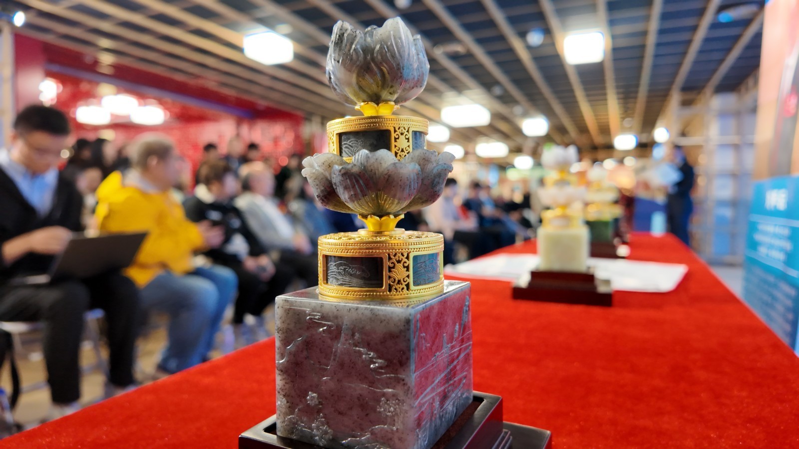 《全运徽宝》由《紫荆徽宝》《莲花徽宝》《五羊徽宝》三方组成,分别呼应港澳广东三地文化符号,既可单独摆放,也能堆叠陈列,隐喻 “湾区同心、全运同行”。作品以传统印玺为载体,运用玉石雕刻、花丝镶嵌、錾刻等非遗技艺,由中国工艺美术大师王建主创、张铁成指导,还联合高校设计团队打磨,将全运精神与湾区风貌融入创作。