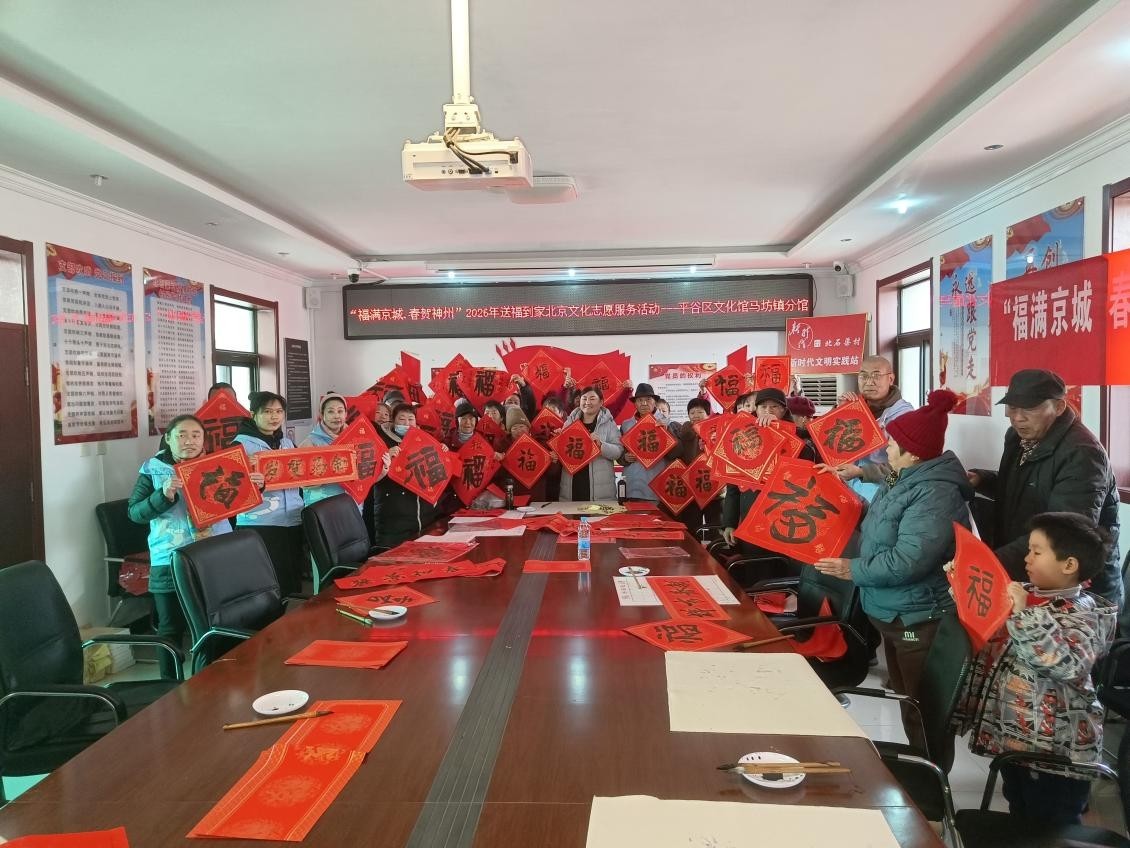 平谷区文化馆马坊镇分馆开展了“福满京城 春贺神州”2026年送福到家文化志愿服务活动。镇域多名书法爱好者与村民齐聚一堂,寄情于笔,将对新年的美好期许寄托在一个个红火喜庆的“福”字中。现场还吸引了许多小朋友参与,他们手握毛笔认真临摹,虽然笔触稚嫩,却充满了对传统文化的热爱。本次活动共书写送出春联、福字200余幅。村民们手持墨香扑鼻的春联,感受着来自社区的真挚关怀与祝福,欣喜地表示这些手写的祝福比购买的更有温度和年味。