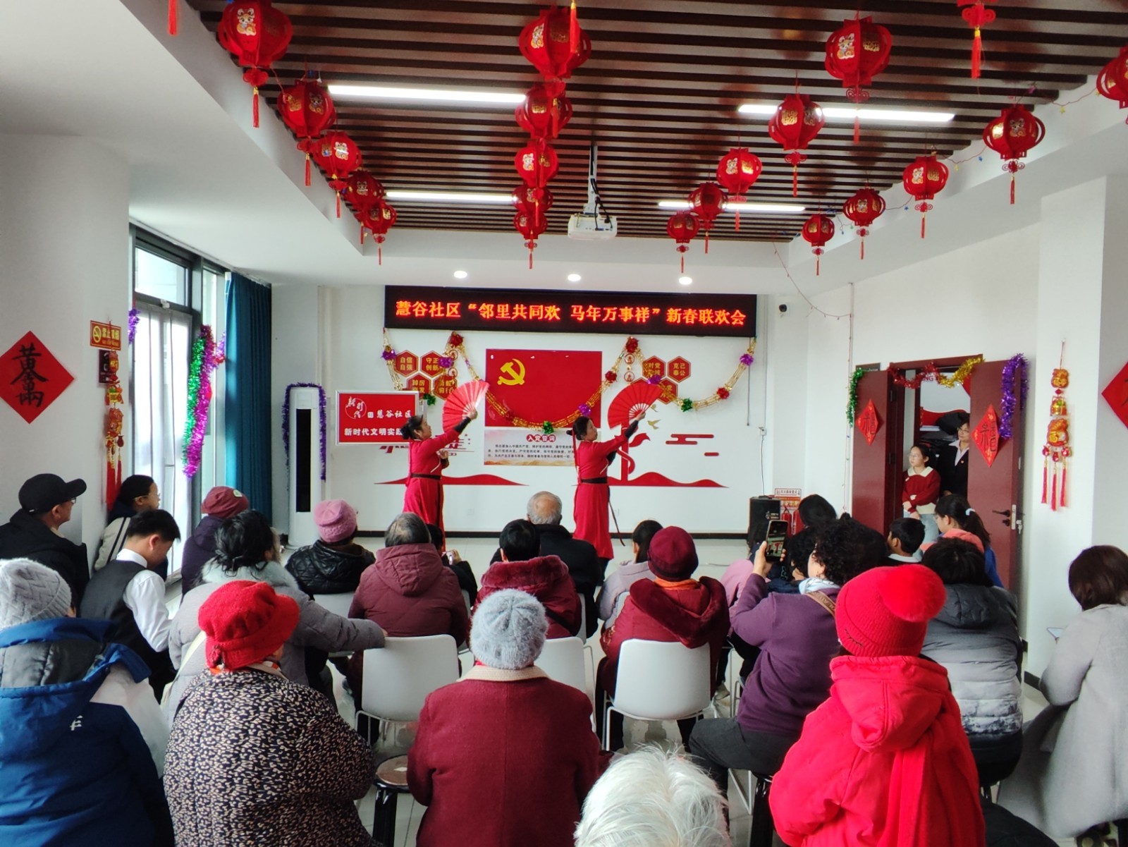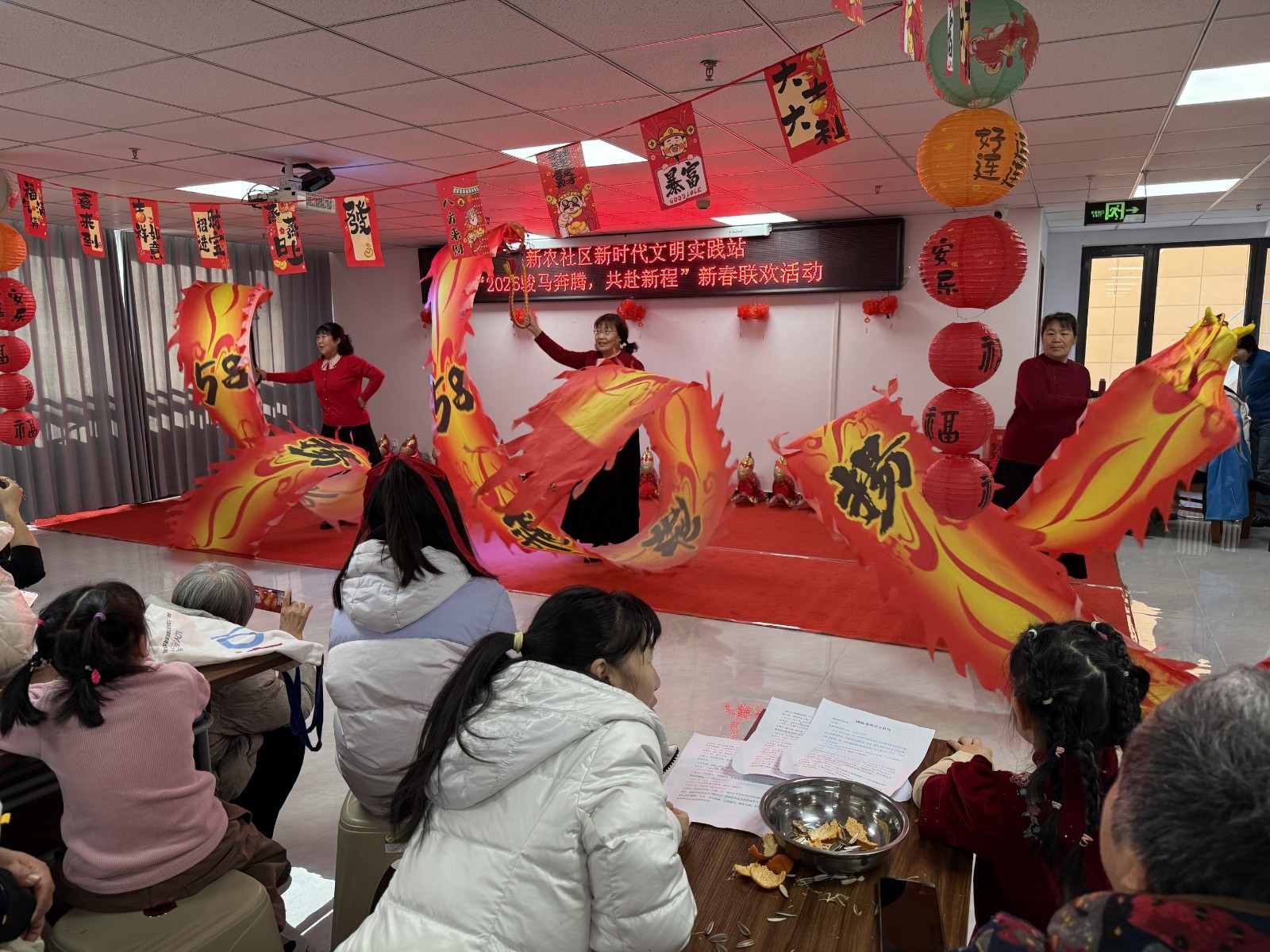 新农社区以“骏马奔腾,共赴新程”为主题举办了新春联欢会。联欢会在欢快的舞蹈《大花轿》中拉开序幕。随后,社区文艺爱好者们登台献艺,三句半《社区这五年》幽默风趣地回顾了社区发展,小朋友的《成语拜新年》歌舞充满童真与希望,合唱《东方大国》与精彩的舞龙表演则将现场气氛推向高潮。联欢会持续近两小时,始终洋溢着喜庆祥和的气氛,居民们在共叙邻里情、共祝新年好中,增强了社区的归属感与凝聚力。
