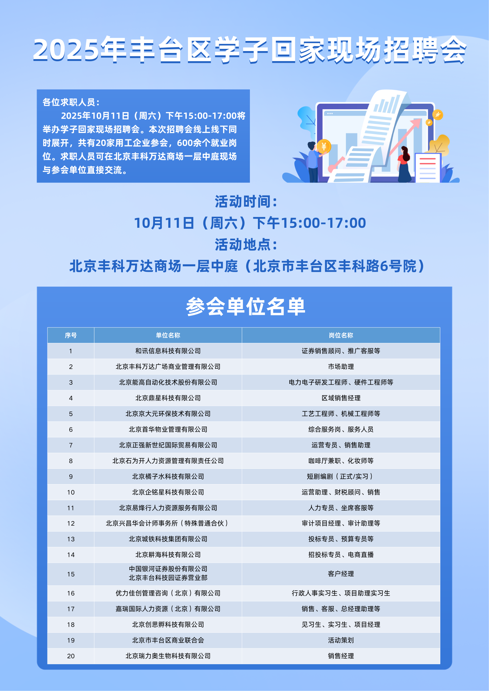 20家企业600余岗位 10月11日丰台区学子回家招聘会就等你来_北京时间